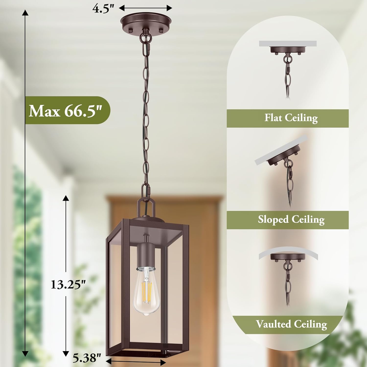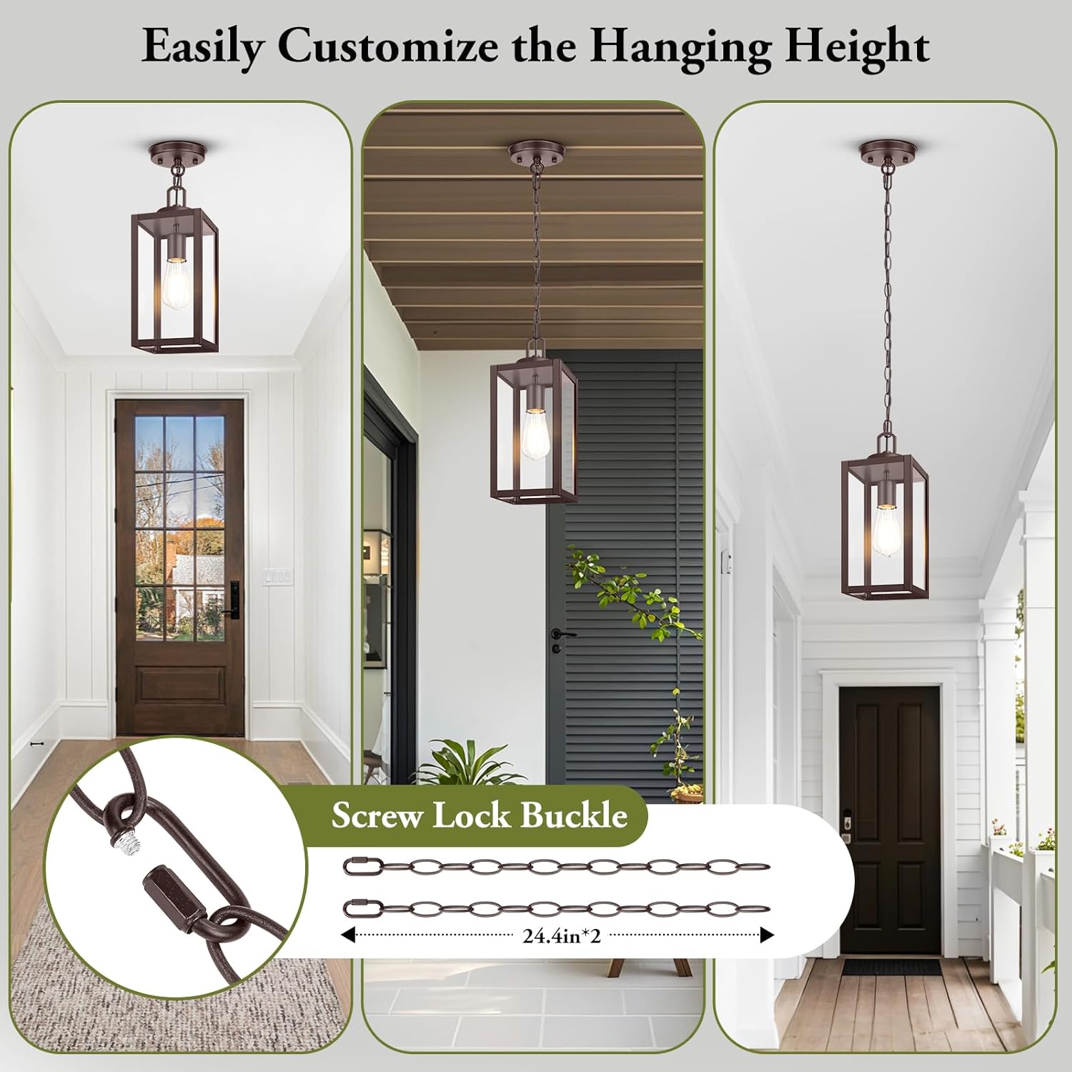 Adjustable Hanging Height: Designed for ultimate flexibility, this pendant light features 2 sturdy 24-inch chains that allow you to easily customize the hanging height to suit any space—whether it’s a cozy porch, a spacious patio, or a charming entryway. Moreover, the durable metal chain is not only built to last but also highly adaptable, seamlessly fitting both flat and sloped ceilings