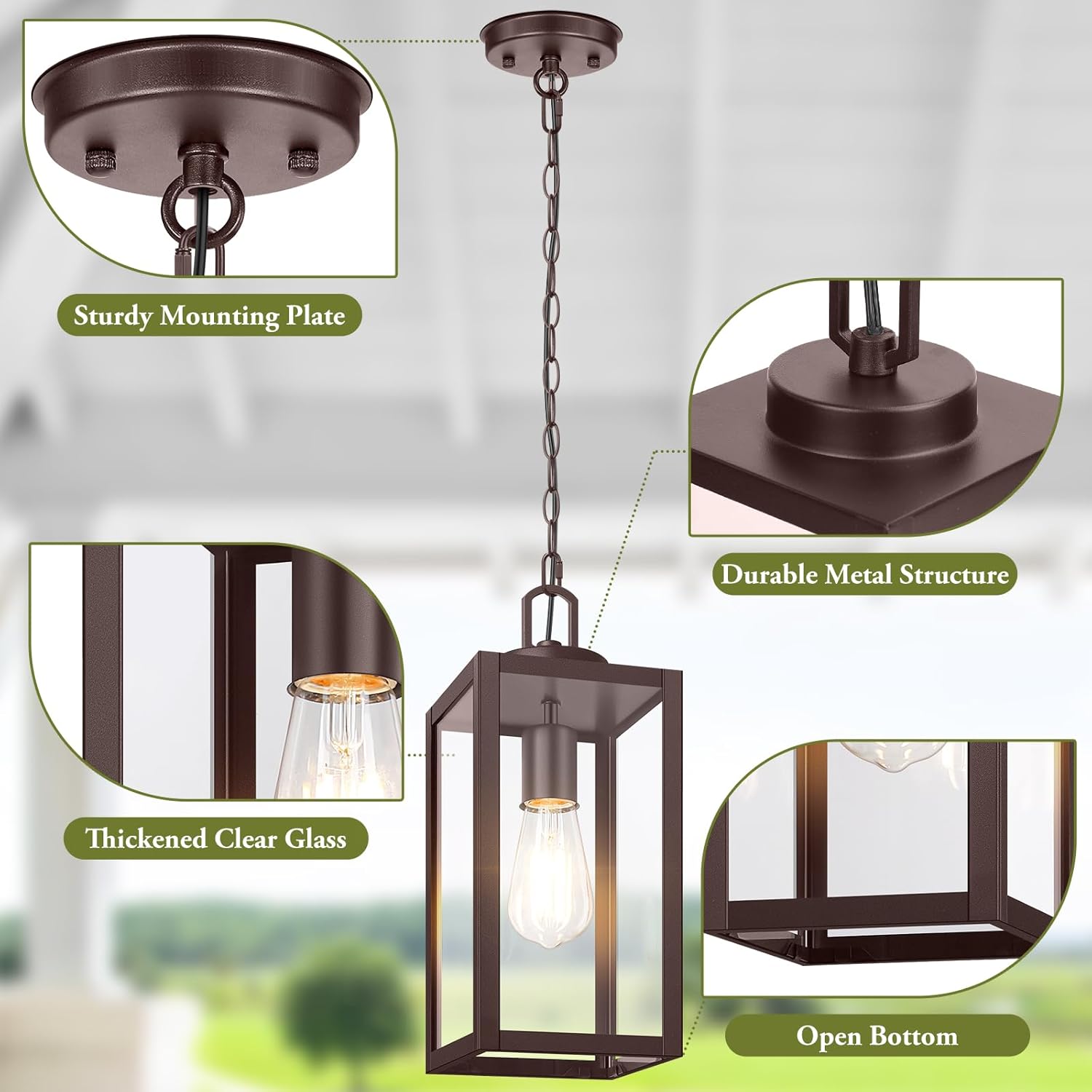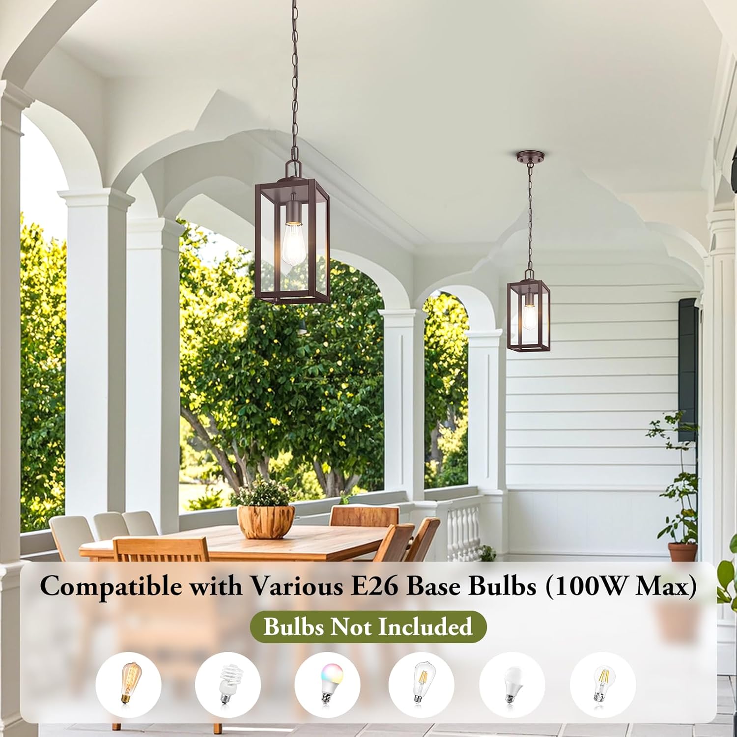 Effortless Installation & E26 Socket: This pendant light fixture arrives pre-assembled with all necessary mounting accessories for a hassle-free setup. The open-bottom design enables easy bulb replacement and cleaning. Compatible with a range of E26 base bulbs(100W Max), including LED, flame, RGB, CFL, incandescent, and halogen bulbs, this outdoor hanging lantern offers versatility in lighting options