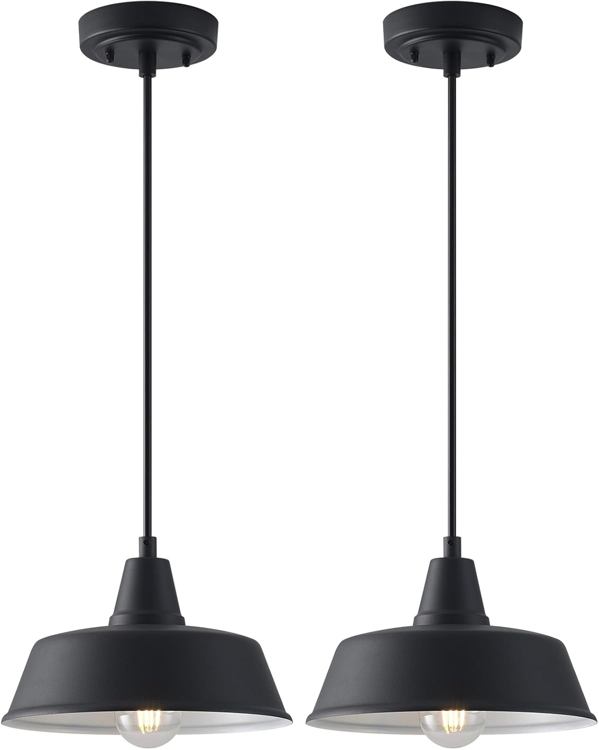 10 Inch Farmhouse Pendant Light: Designed with a matte black finish plus white interior industrial dome shade, the barn hanging lights bring a classic but stylish look. The 94″ adjustable SVT cord simply customizes hanging height to meet any lighting installation area. The farmhold style ceiling mount light has a frosted gold inner that can enhance the light reflection for brighter illumination.