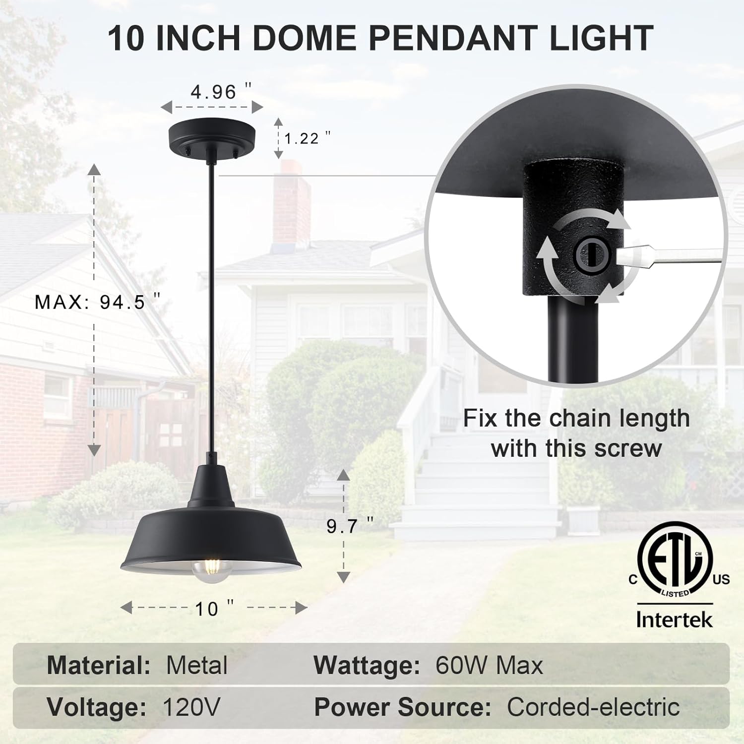 Ficture Dimension: Dome Shade Diameter: 10″D, Dome Shade Height: 6 1/2″H; Ceiling Backplate: 5″ D; Pendant Chain Length: 94″ Maixmum. (Adjust by the top screw on the backplate, and the extra chain can hide behind the backplate)