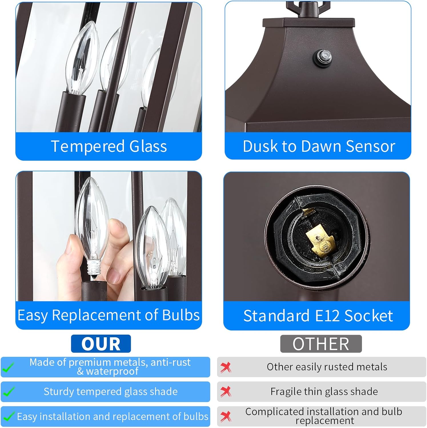 【Easy To Install And Standard E12 Socket】 No need to assemble by yourself. The black lanterns outdoor are easy to install and only take a few minutes to complete. The bottom opening design makes it extremely simple to replace the bulb, and no tools are needed. The bulb socket fits any bulb with a standard E12 socket, Max 40w. (Bulbs not included)