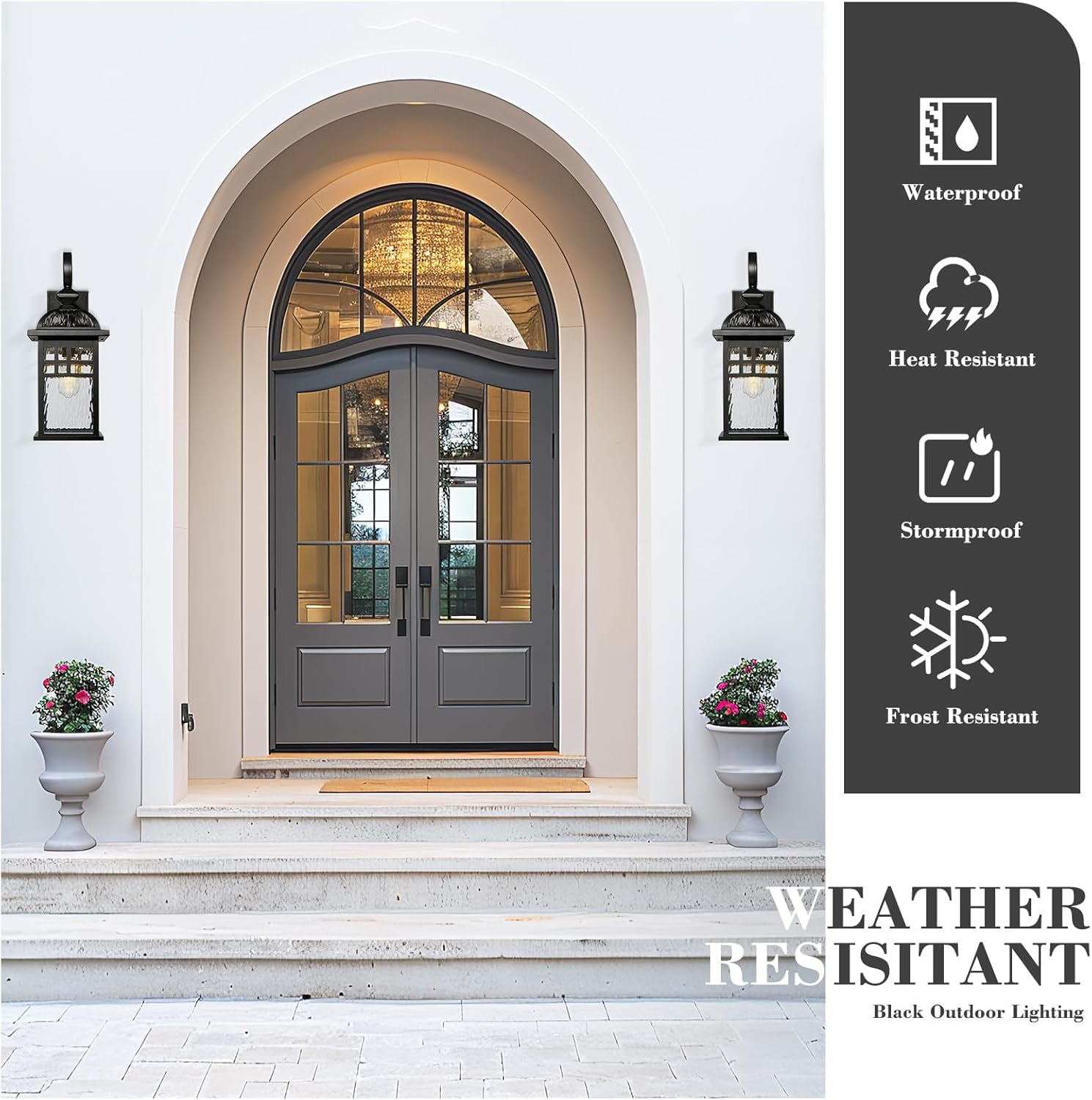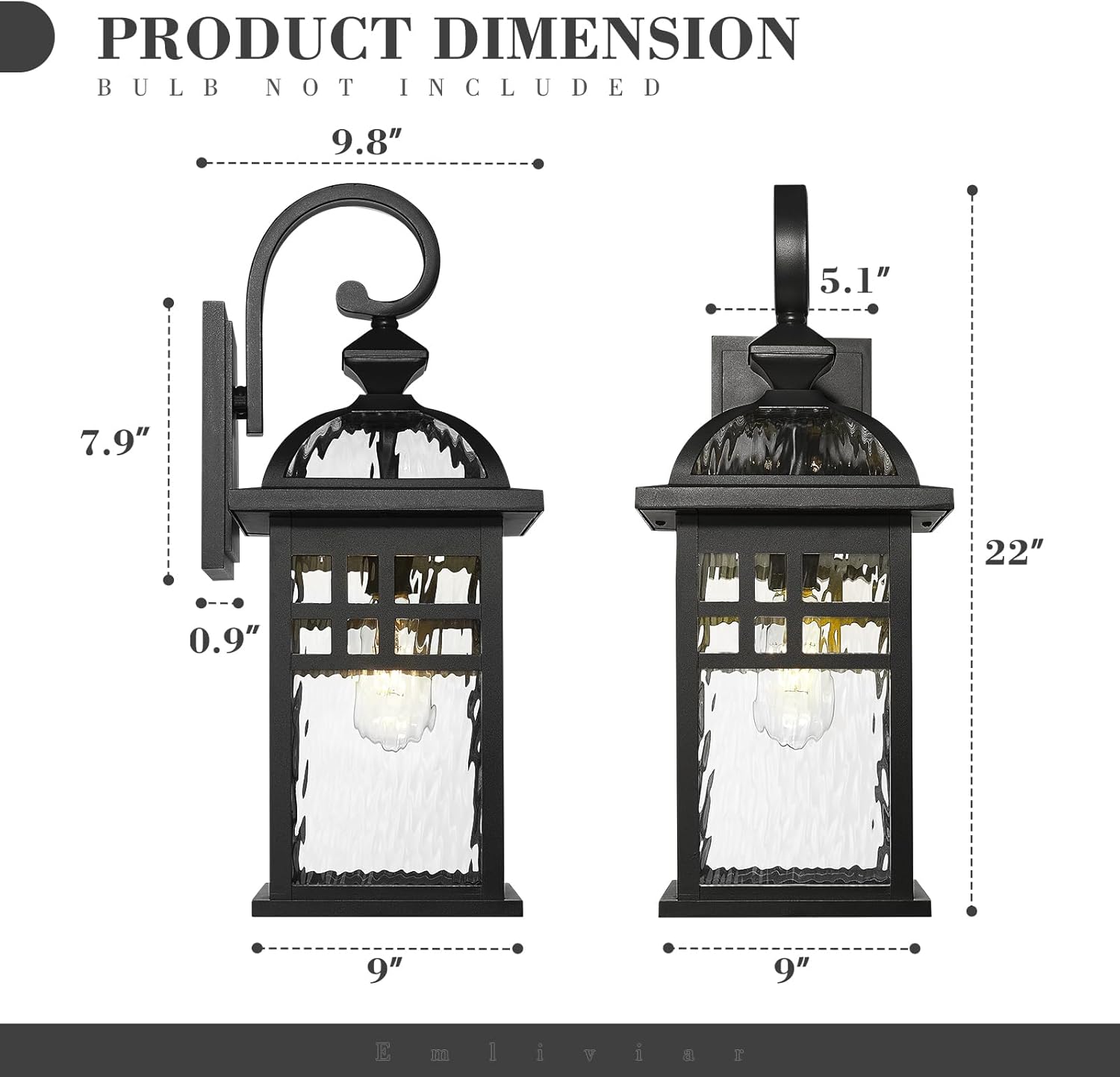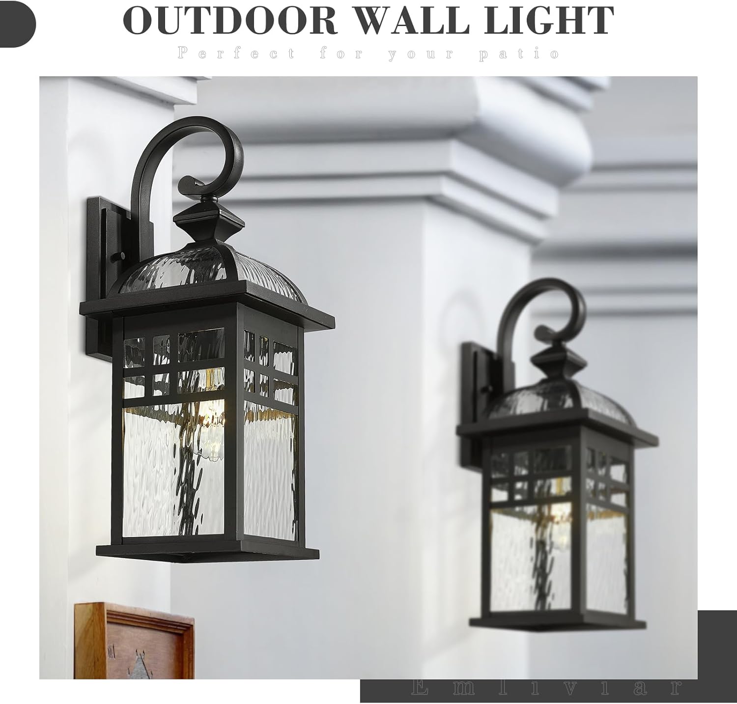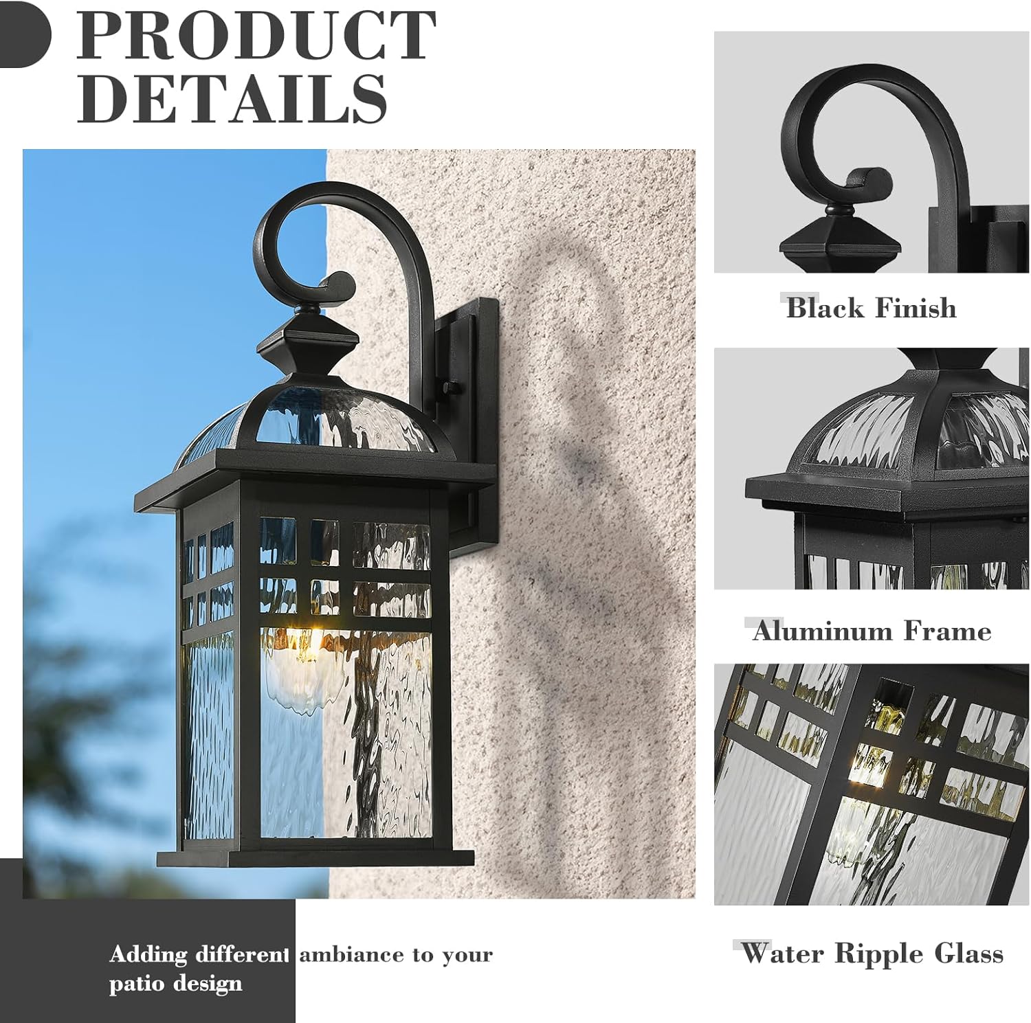 Weather-resistant and rust-resistant, this large outdoor black porch light sturdy metal and aluminum construction with water ripple glass shade, suitable for wet locations. The black finish suits any house decoration.