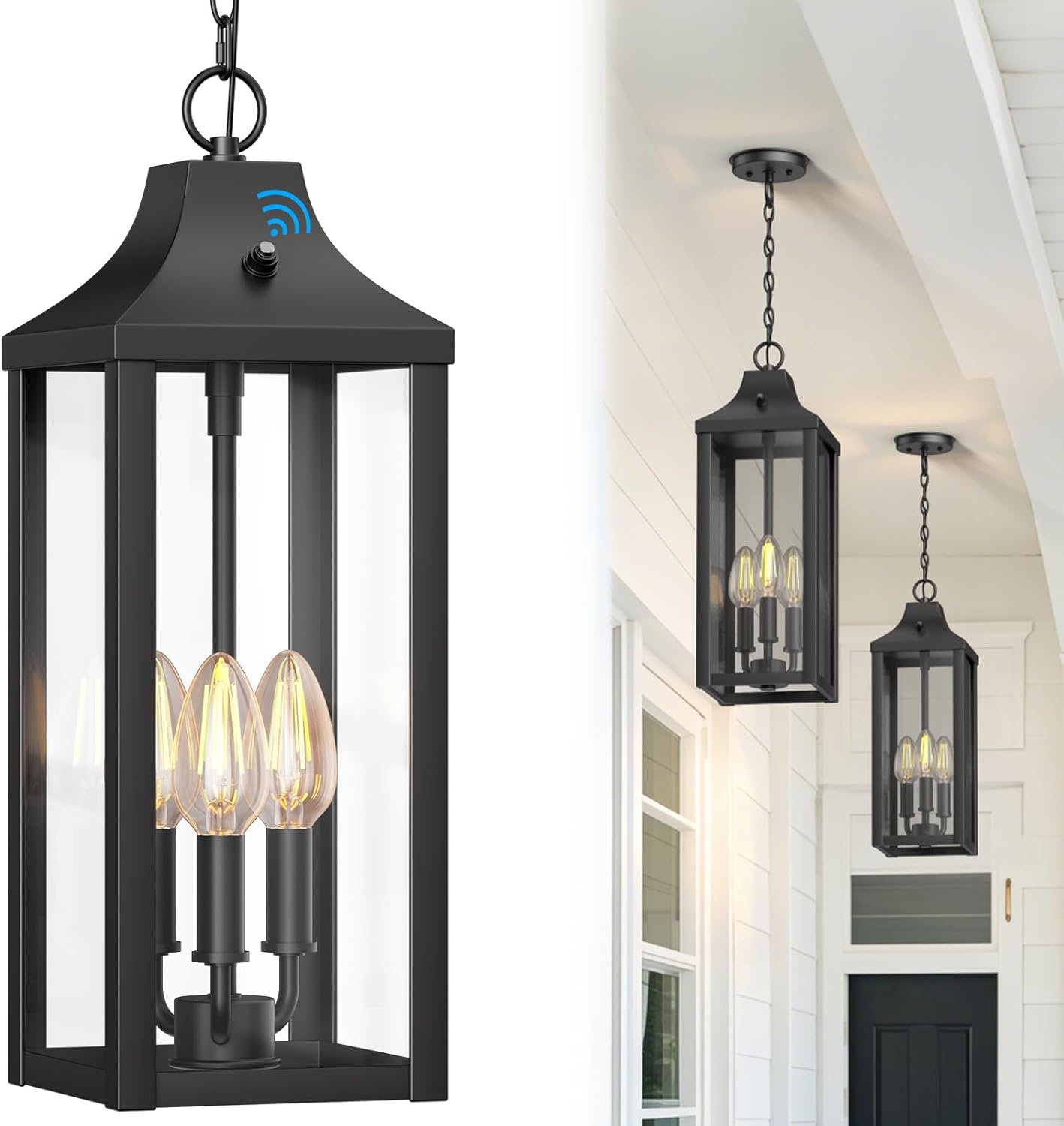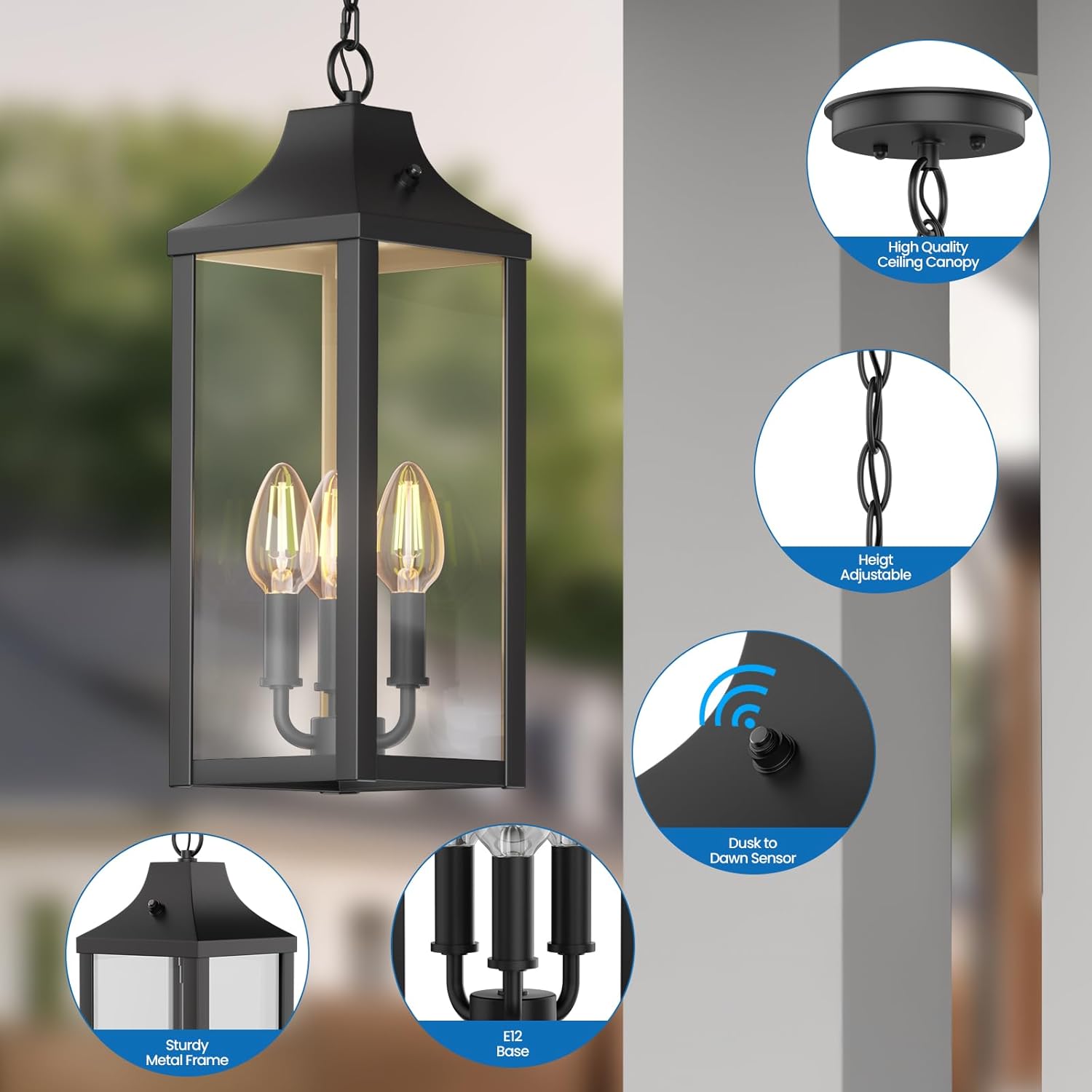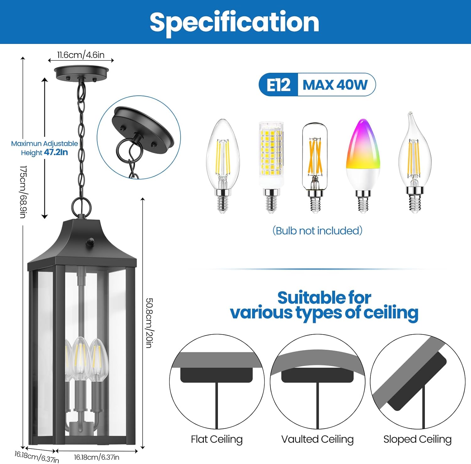 Easy Installation: Designed for simplicity, outdoor chandelier for porch requires no assembly and can be installed in minutes. The motion hanging porch light, outdoor porch light fixture bottom opening design allows for effortless bulb replacement without tools. Compatible with standard E12 interface bulbs (up to 40W), ensuring flexibility in lighting options. (Bulbs not included)