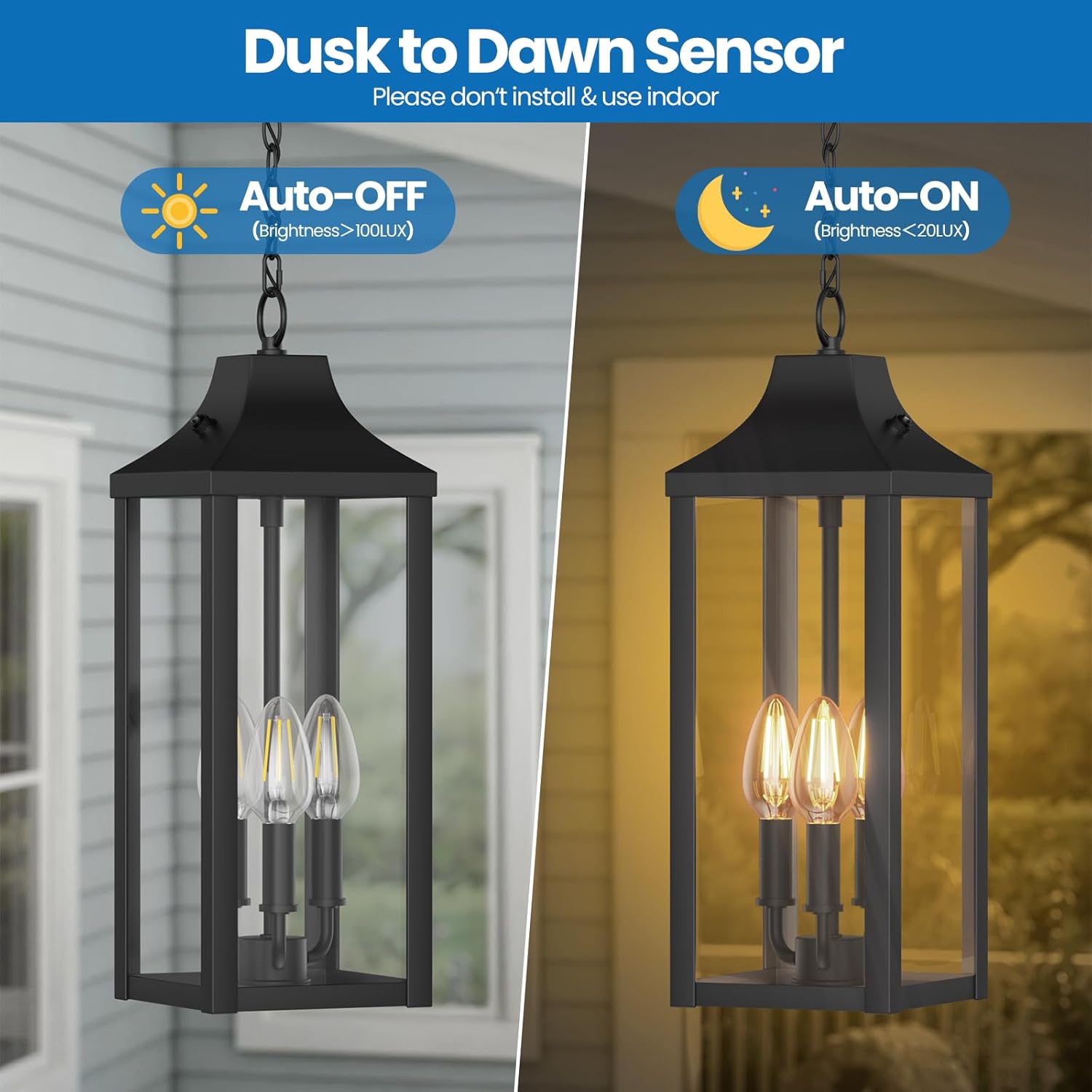 Dusk to Dawn Sensor Exterior Porch Ceiling Lights: Equipped with advanced photovoltaic sensors, dusk dawn outdoor lighting fixture automatically turns on when ambient brightness drops below 2LUX and turns off when it exceeds 10LUX. The outdoor pendant lights dusk dawn outdoor lighting fixture also comes with a light sensor cap accessory, which is flexible in operation and supports both auto-sensing and manual adjustment, providing more convenience