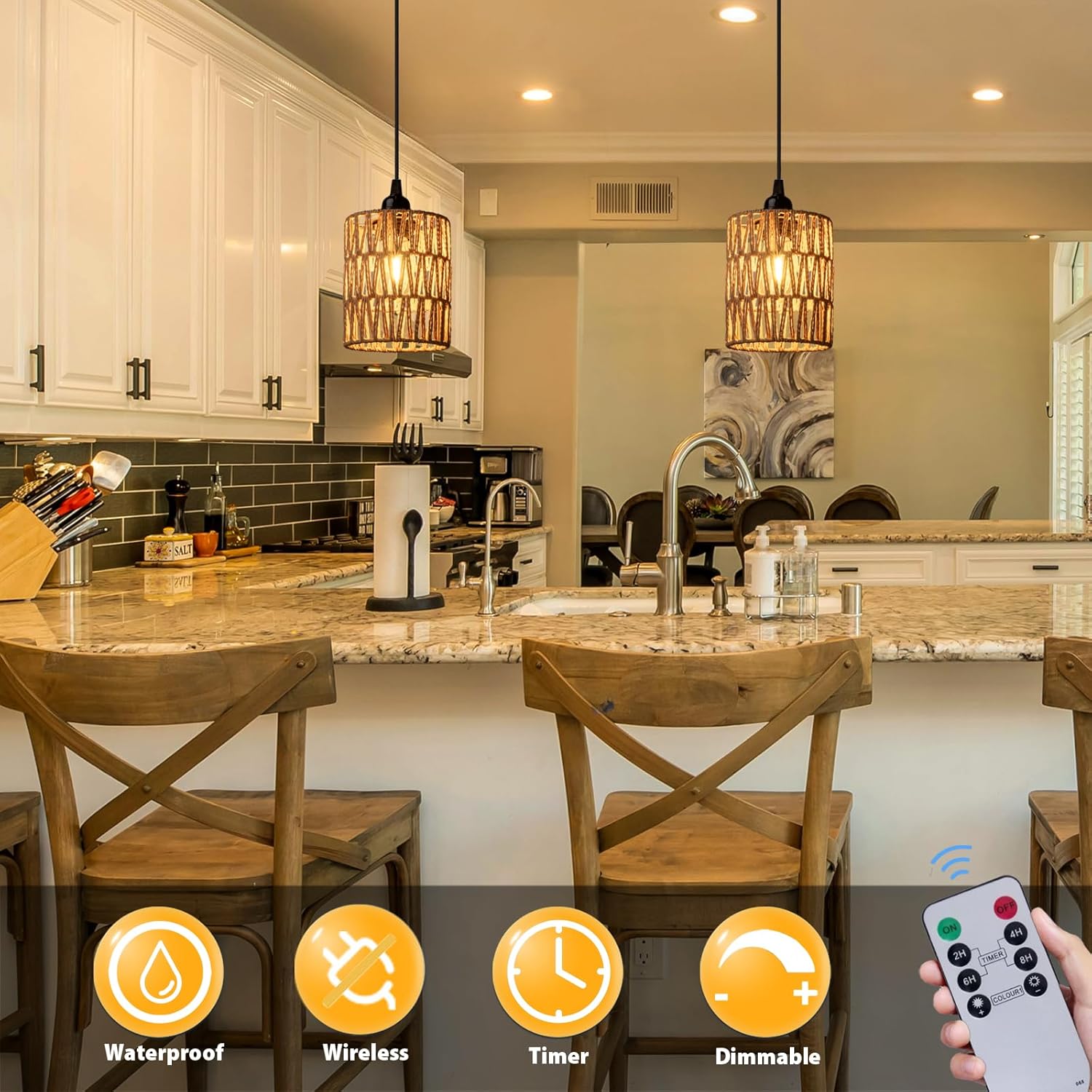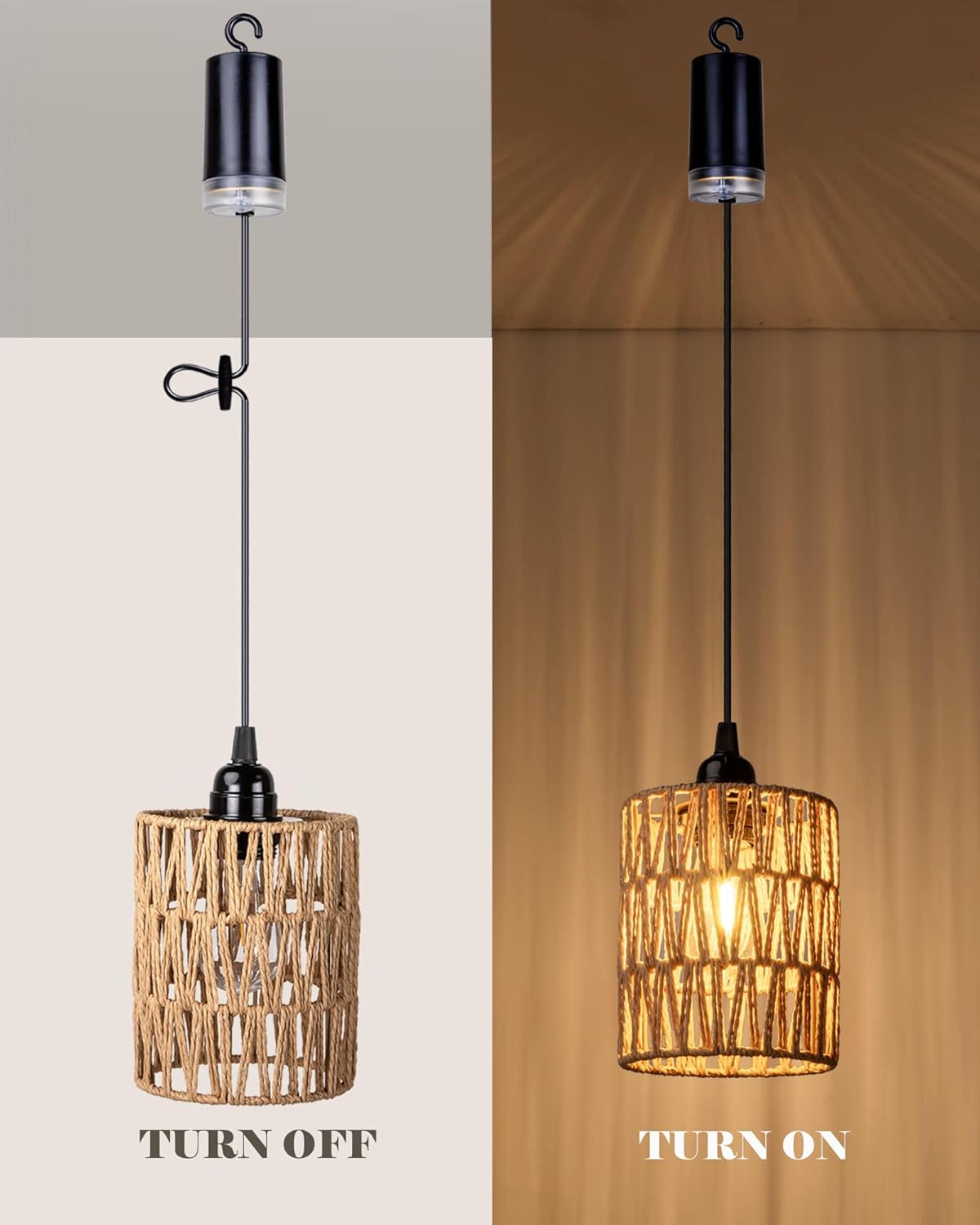 【Easy Setup】This battery operated pendant light with a Panel allows you to effortlessly create a cozy ambiance with easy of brightness and timer. Can also adjust the hanging height of the light to suit your needs.