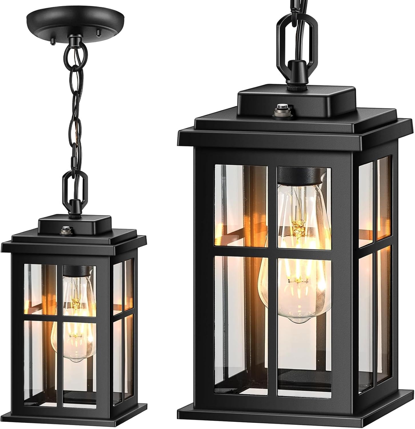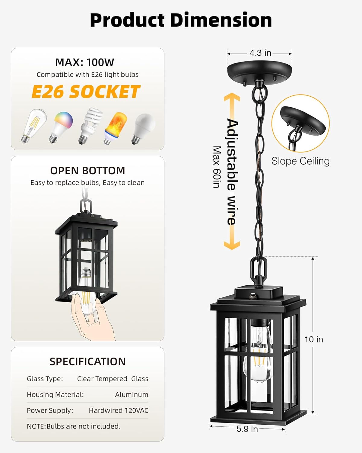 🔧 Easy Installation & Adjustment: The installation process is simple and convenient, featuring freely adjustable suspension chains with a maximum extension length of 59 inches to flexibly accommodate varying eave heights and sloped ceilings. The unique bottom-access design allows for tool-free bulb replacement, easily completed by hand. Compatible with standard E26 sockets, our outdoor ceiling lights for porch support bulbs up to 100 watts (bulb not included). You can freely choose from LED and other bulb types to effortlessly achieve personalized lighting upgrades.