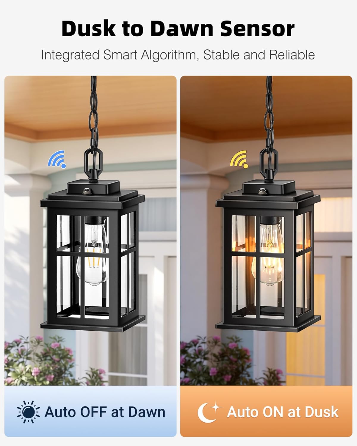 🌓 Auto Dusk to Dawn Sensor: This outdoor pendant light features a built-in smart light sensor for fully automated lighting management. The outdoor chandelier for porch automatically turns on as dusk falls and switches off at dawn, eliminating the need for manual operation. This not only enhances daily convenience but also conserves energy by preventing unnecessary power consumption. Automatic lighting also enhances home security by illuminating your porch when you return late at night or simulating occupancy when you’re away, deterring potential intruders. It’s suitable for various outdoor settings, including front doors, driveways, and backyards.