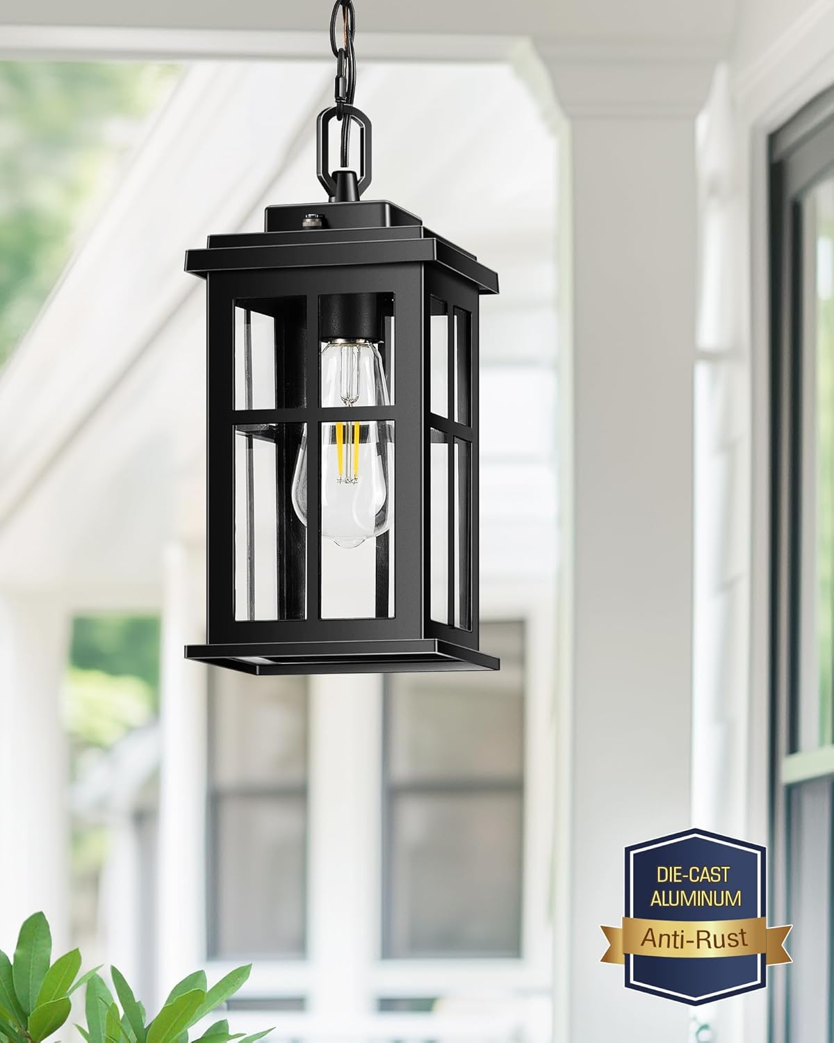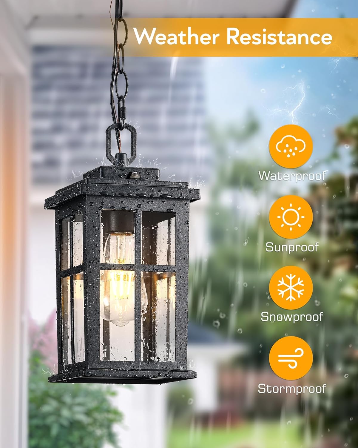 🛡️Waterproof & Rust-Resistant: Engineered to withstand harsh outdoor conditions, the outdoor pendant lights for porch body features 100% rust-proof aluminum and fully sealed construction, delivering exceptional waterproof, dustproof, and weather-resistant performance. It withstands torrential rain, snow, extreme heat, and salt spray corrosion, ensuring long-term durability and stability for outdoor use. The robust tempered glass lens offers superior impact resistance far exceeding ordinary glass, fundamentally solving the common issues of rust and damage in outdoor lighting fixtures. We promise you enduring, reliable illumination.