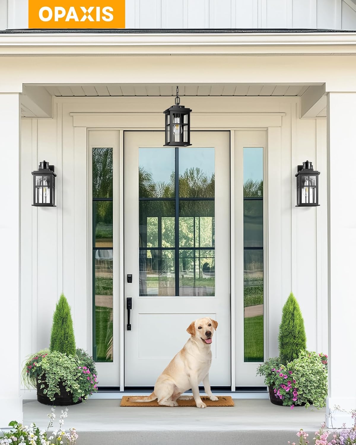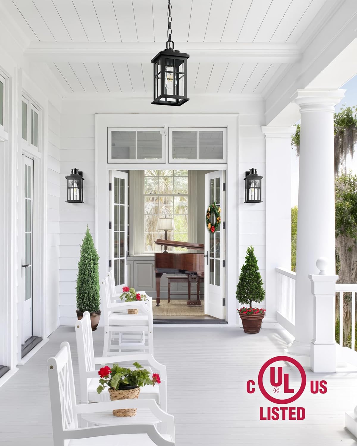 🏡 Classic Farmhouse Design: The hanging lights for outside features a classic rustic design, seamlessly blending a modern matte black finish with a translucent tempered glass shade to add timeless charm and warmth to your home’s exterior. Its soft, diffused light creates an inviting ambiance, effortlessly complementing both contemporary minimalist and traditional American-style architecture. It elevates the overall elegance and aesthetic appeal of your home, making your porch or entryway particularly enchanting after dark.