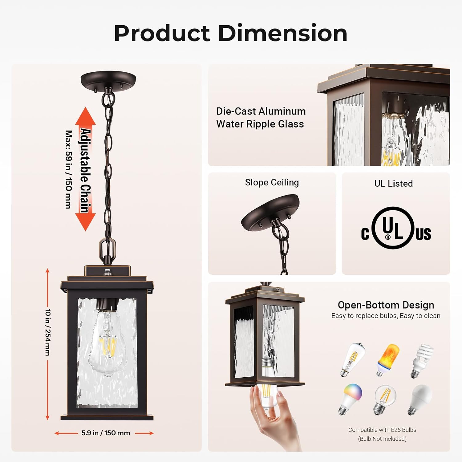 Easy to Install & Standard E26 Socket: No assembly required. The hanging porch light fixture is easy to install and can be completed in just a few minutes. The bottom opening design makes it very simple to replace the bulb without any tools. The bulb socket is suitable for any bulb with a standard E26 socket, up to 100 watts, including LED, CFL, halogen, etc (Bulb not included)