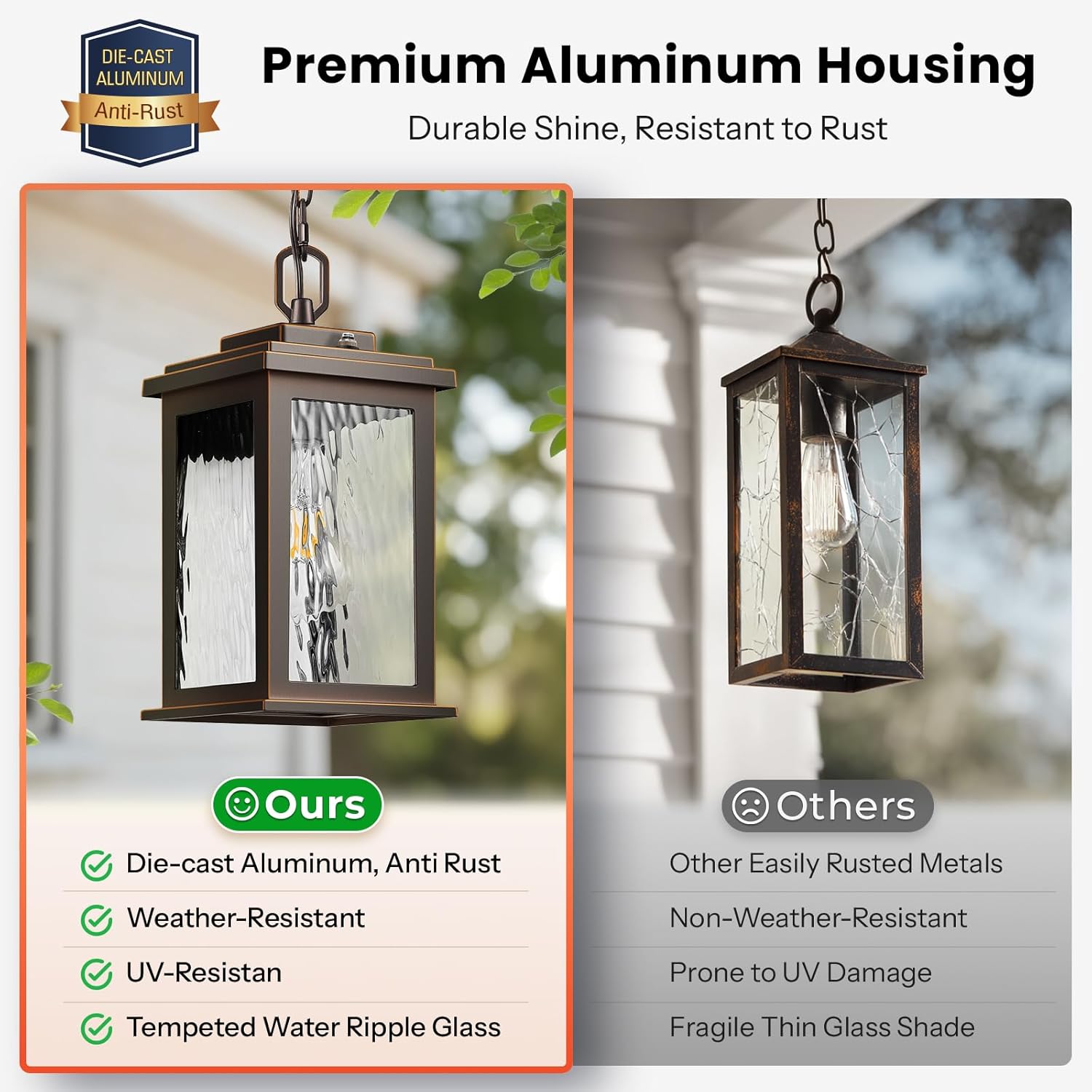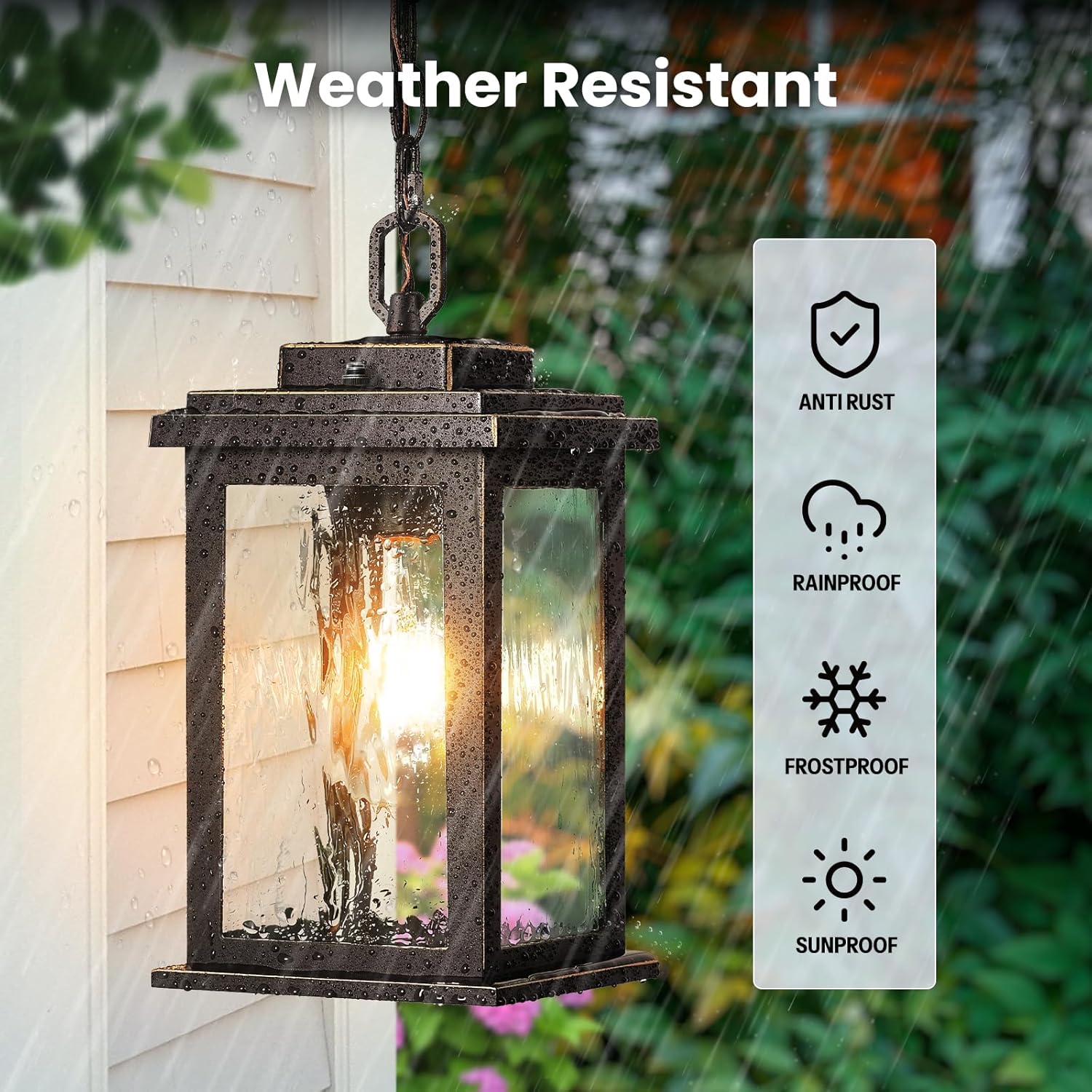 Anti-Rust & Weather Resistant: Crafted from solid die-cast aluminum, this outdoor pendant lights for porch is built to last. The rust-resistant, waterproof housing stands up to rain, snow, humidity. Unlike flimsy metal fixtures that corrode or break over time, this one stays strong and reliable season after season, giving you peace of mind and lasting performance.
