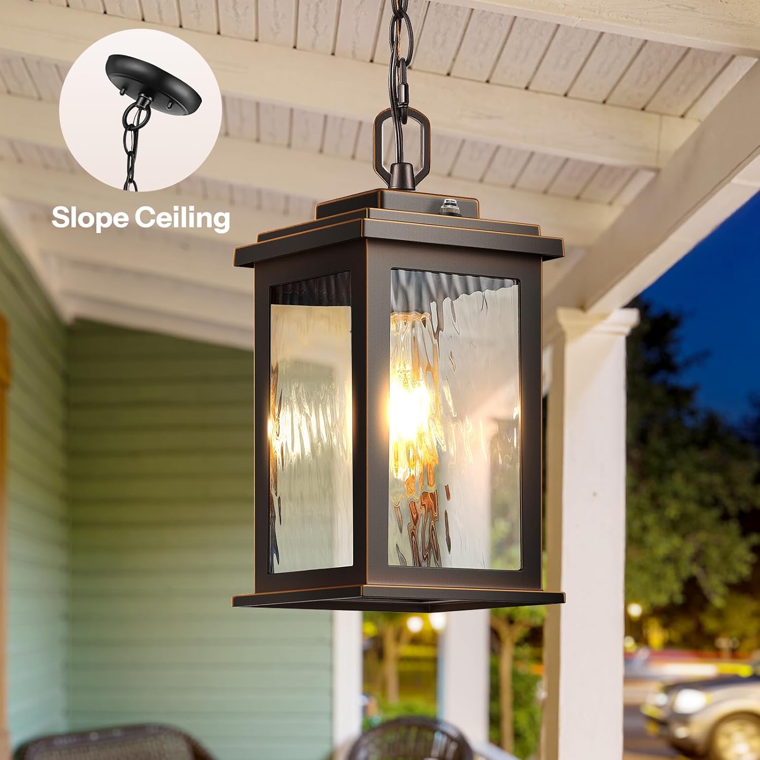 Adjustable Hanging & Sloped Ceiling Friendly: Designed to fit a variety of spaces, this outdoor pendant light comes with an adjustable chain that makes it easy to customize the height to suit vaulted ceilings, low beams, or covered porches. It also installs smoothly on sloped ceilings, giving you more flexibility when decorating patios, garages, or entryways. You can quickly achieve the perfect look and lighting for your outdoor space.