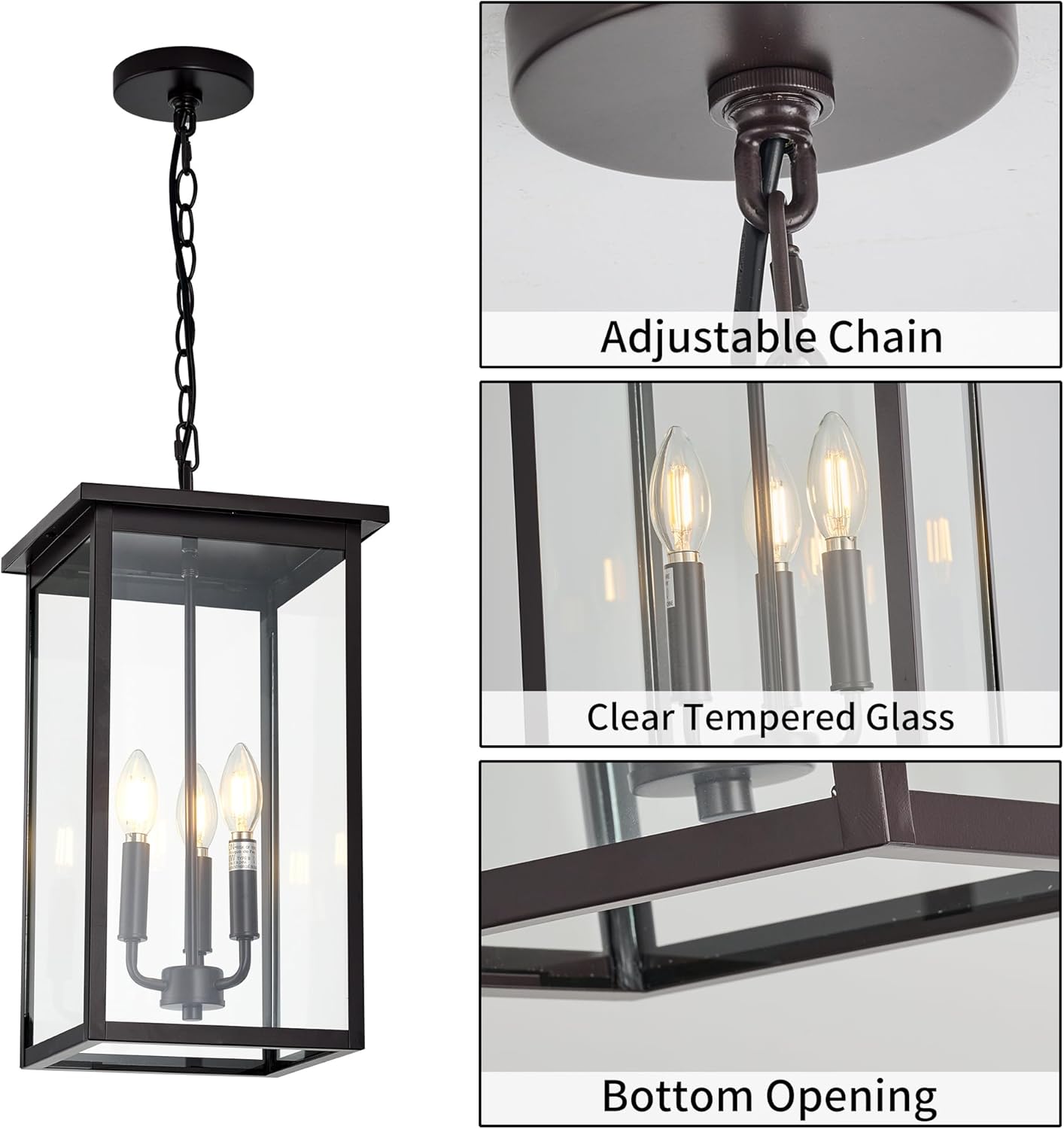 Our exterior ceiling fixtures is 100% premium metal with a Oil Rubbed Bronze matte finish. This hanging light is waterproof, anti-rustic, and weather resistant. Unlike other fragile glass panels, our outdoor hanging lanterns take high-strength tempered glass, sturdy and durable. These outdoor decorative outside hanging light can provide light where needed most for outdoor steps and porch entries.