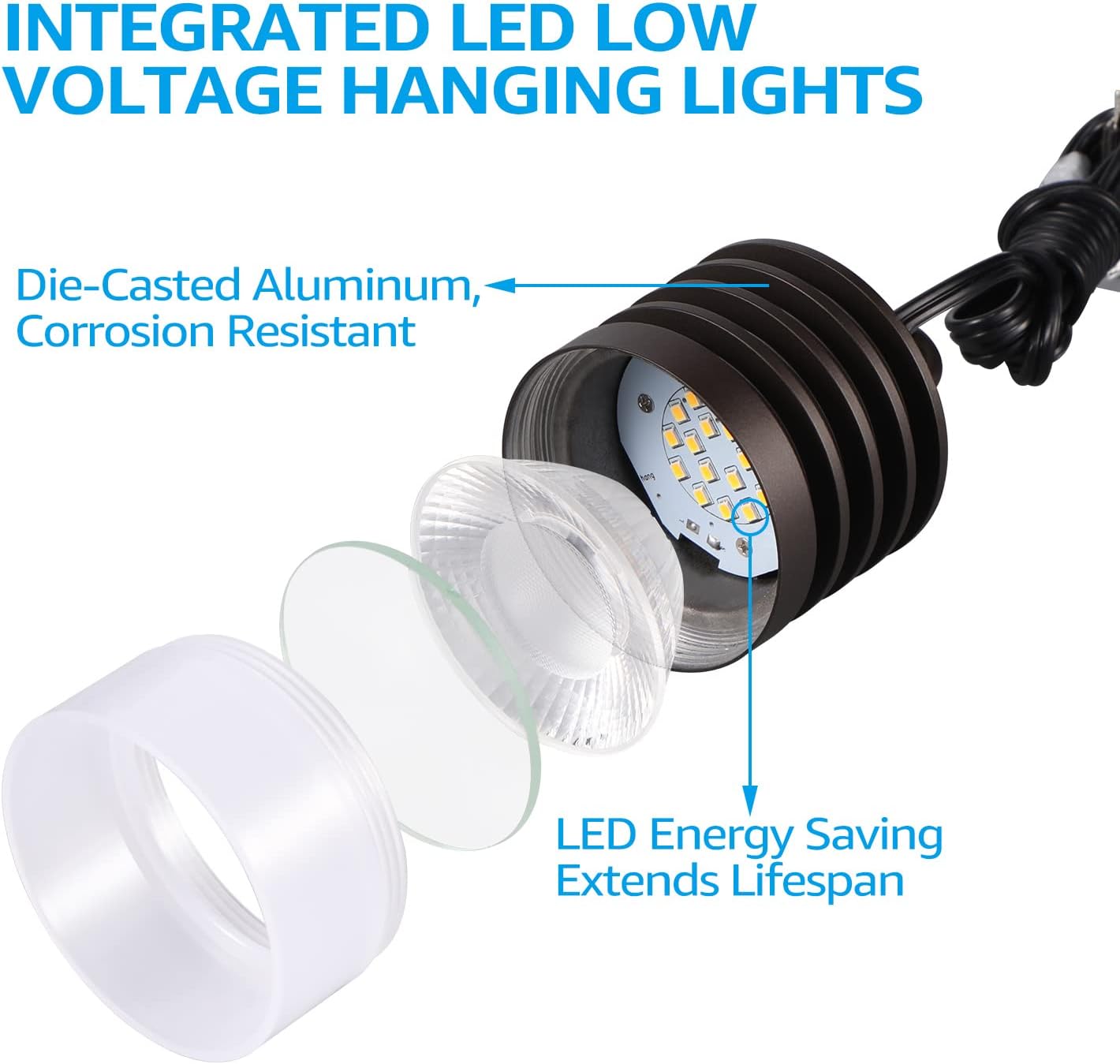 Easy Installation: Includes chains, screws, and waterproof connectors. Each light has 4.92ft wiring. Note: a 12-36V low voltage transformer, connectors, and extra cable are required for complete installation, making setup simple and convenient