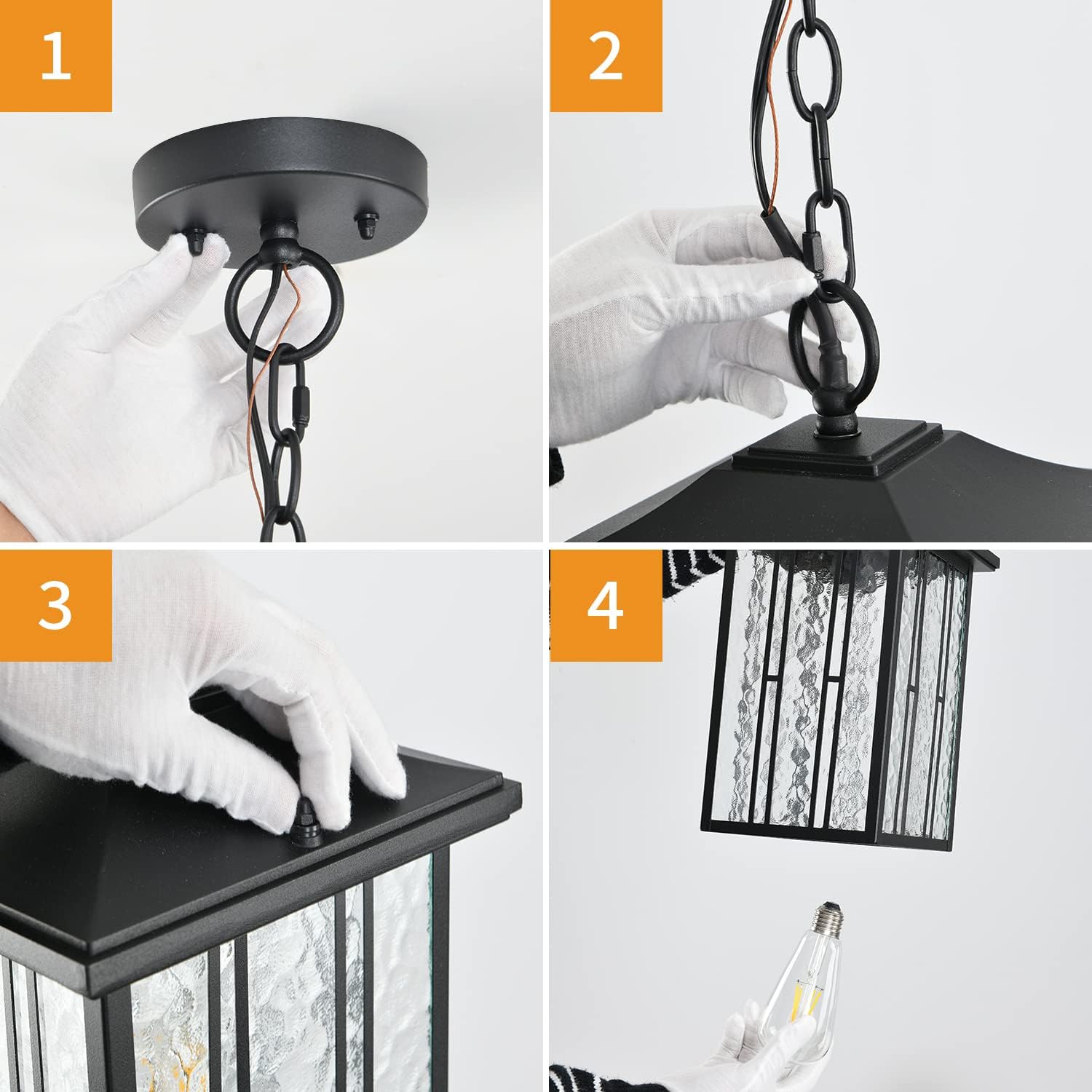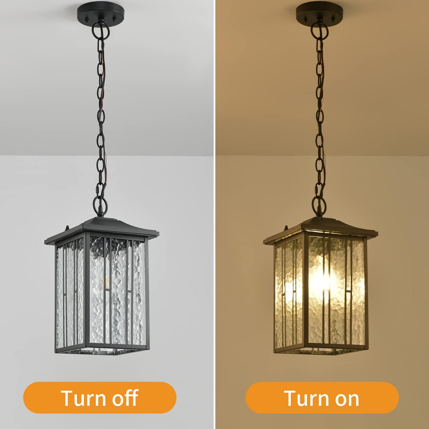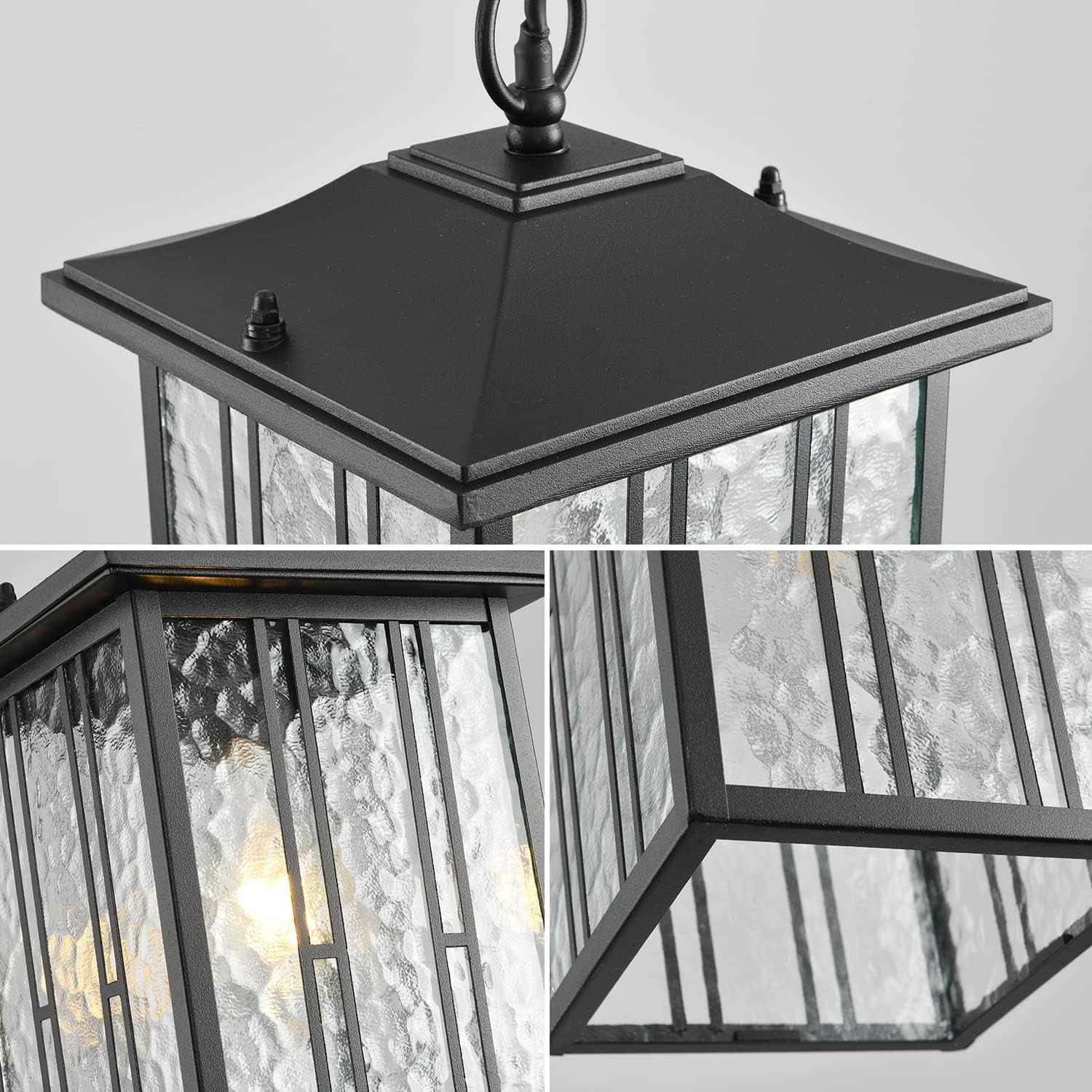 [Simple and Stylish Design ]: This outdoor pendant light for the porch is made of a black aluminum frame with water-rippled glasses, a simple and classic design. This black outdoor pendant light will add a more vintage and elegant atmosphere to your house when you use it for decoration
