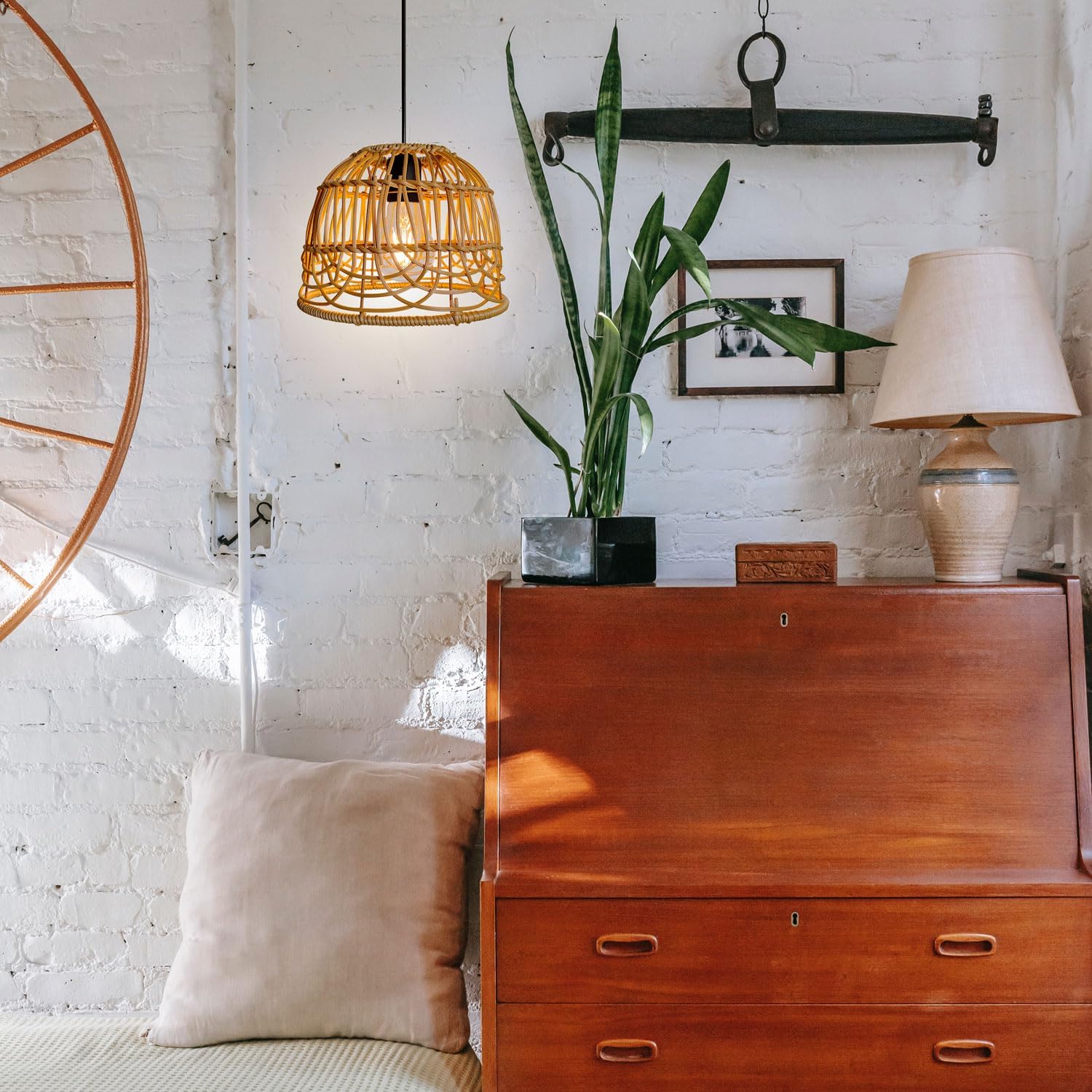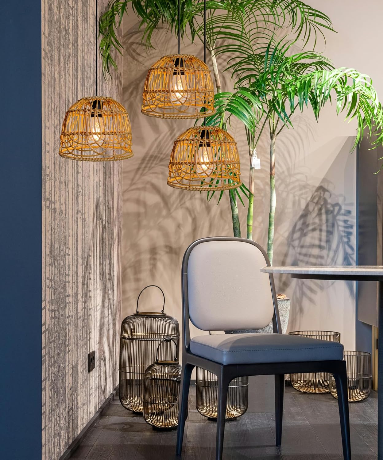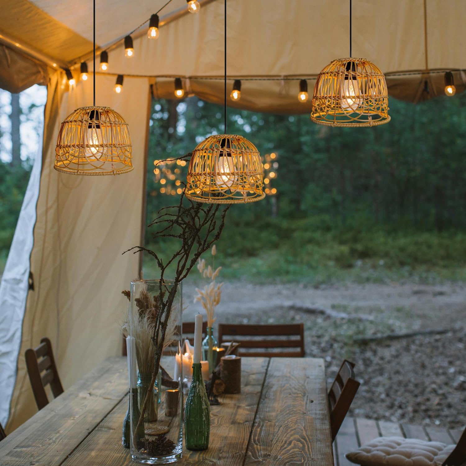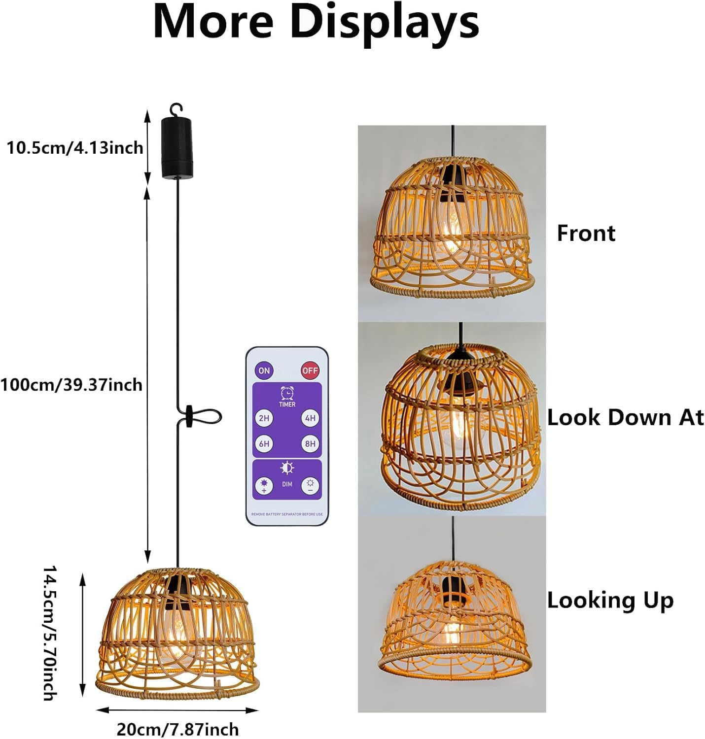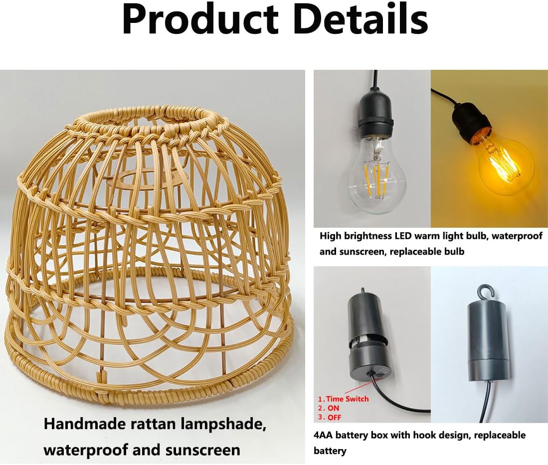 Handwoven Rattan Bamboo Lampshade – Φ7.87 inch. The shade of this battery operated hanging light is hand woven with Handmade plastic rattan, exuding Bohemian or rustic charm. Its cute design softly illuminates your gazebo , porch or patio