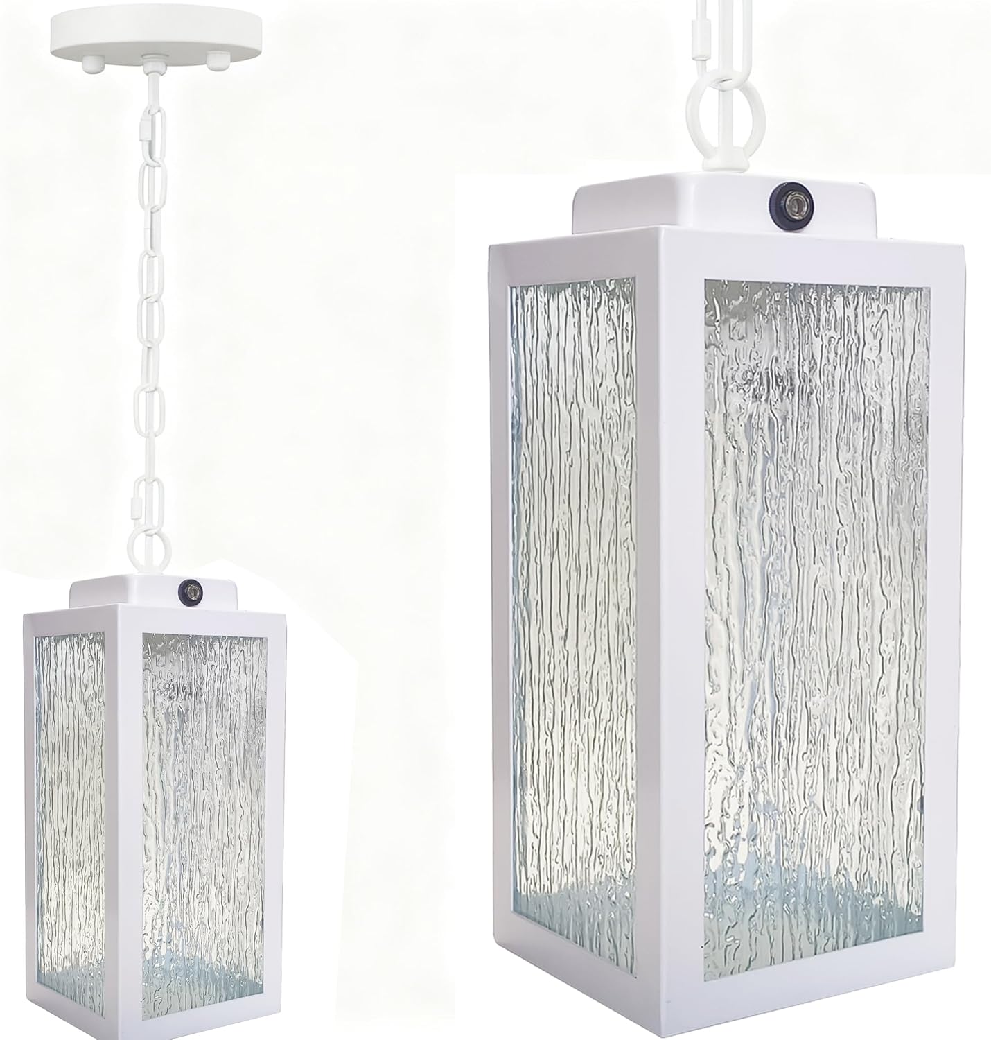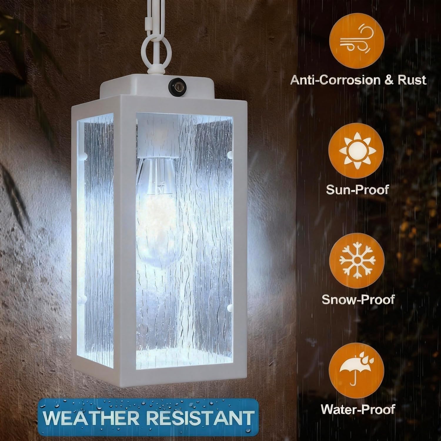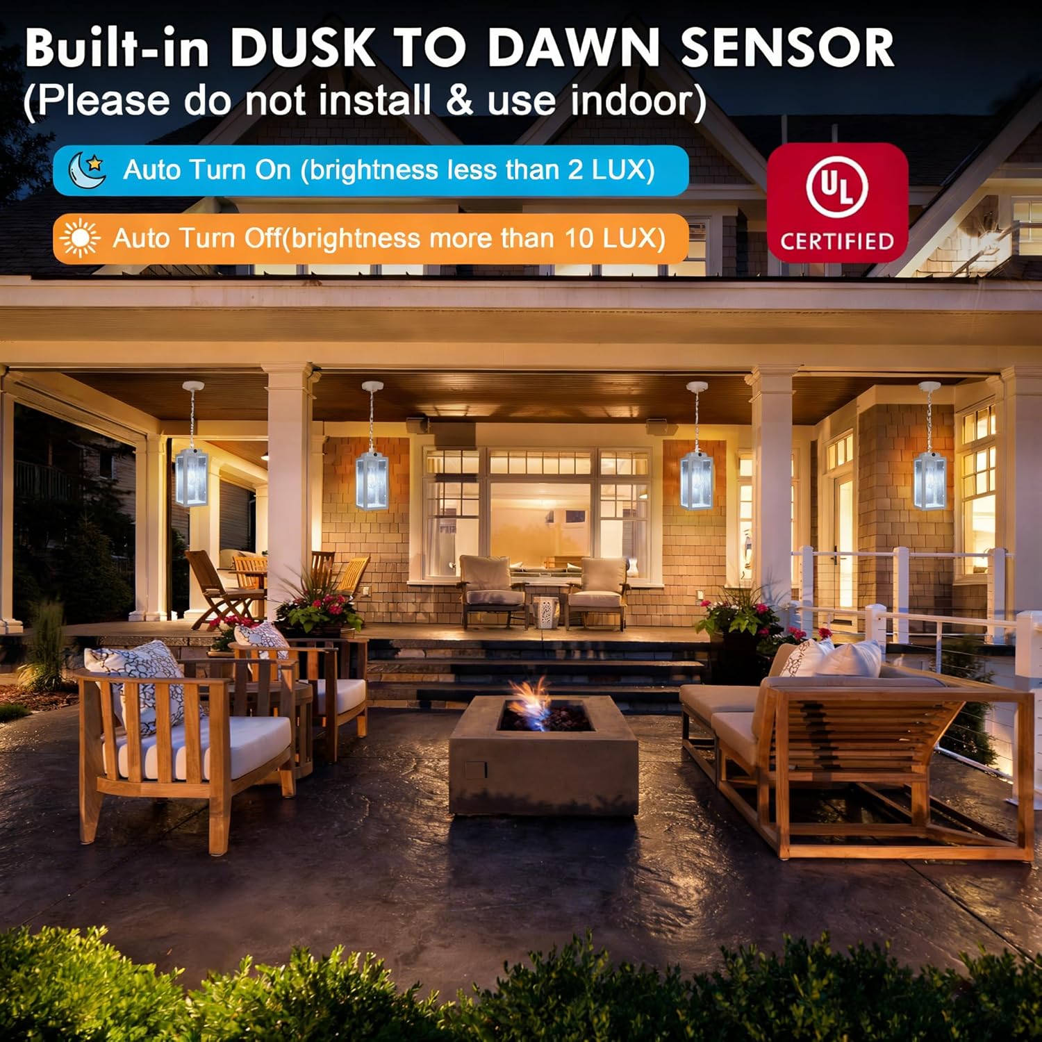 Free your hands, you’ll never have to worry about turning this outdoor pendant light on and off. Why? With the dusk-to-dawn sensor, this outdoor chandelier for porch will automatically turn on at night when the environment is dark (below 2 LUX) and turn off during the day (above 10 LUX). Also, it saves on electricity costs. Outdoor ceiling lights for porch can only be used outdoors. (since the sensor can’t work for indoor use)
