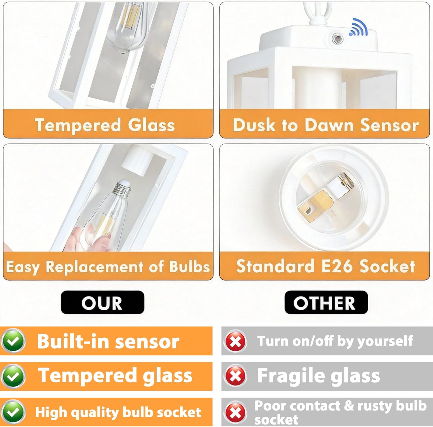 How to check if your lights are working properly. After the installation is completed, if you find that the porch light is not on, please use the cover to block the sensor up to about 30 seconds, the light will be on; if you need the pendant light to go out, please use the flashlight to shine on the sensor about 15 seconds, the light will go out.