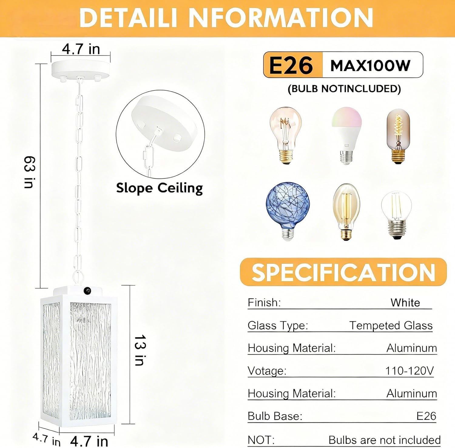 Any bulb with a standard E26 socket can be used in our outdoor hanging light. The opening design at the bottom of lightshade makes it easy to change bulbs. Light’s 63-inch long chain is height adjustable as needed. (Bulbs not included)