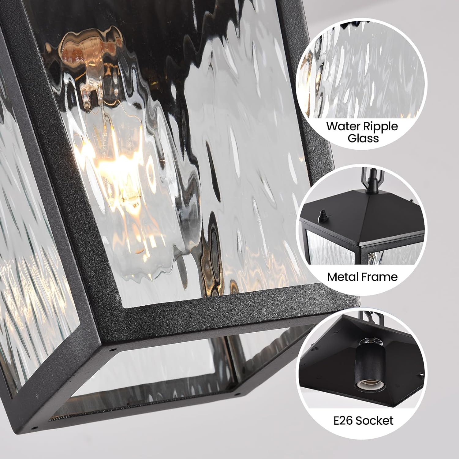 [Easy installation]: No need to complex assemble, the exterior hanging porch light includes all mounting hardware(Blub NOT included). Cause the glass is pre-assembled for you, so just take a few steps you can finish the installation, saving time and labor costs. Opening-bottom design increases the amount of light underneath and easy maintenance