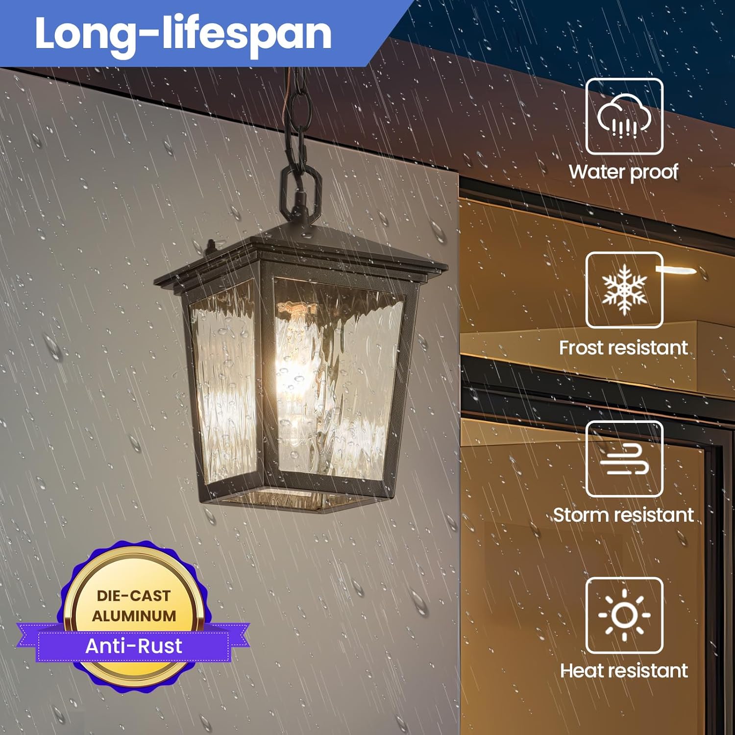 [Weather-resistant & Wide Application]: Constructed with a sturdy metal frame and thickened glass panel, our exterior chandelier is waterproof and durable enough to withstand any weather changes, from sun to snow, rain to ice. The high-quality metal effectively prevents the pendant light from rust or corrosion to keep its stylish look for years of usage