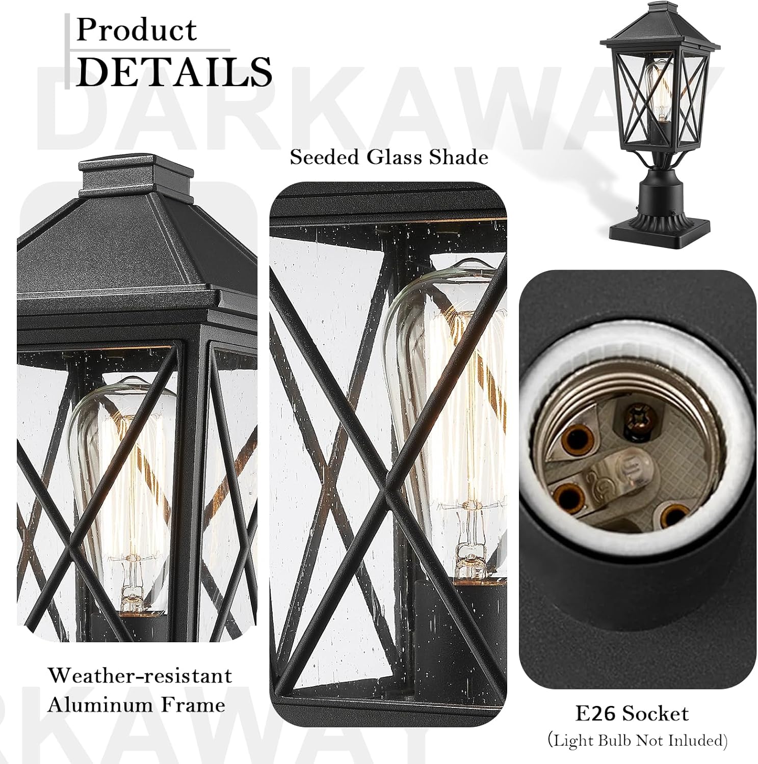 Size and Bulb – 6.5 “(L) x 6.5” (W) x 13.38 “(H). Outdoor Post Light supports all E26. Fully compatible with LED, Incandescent, CFL, Halogen (Bulb not included).