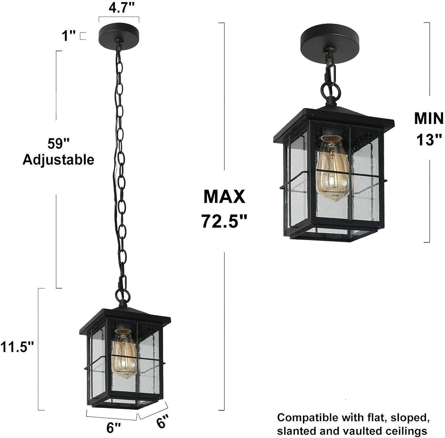 Ideal Size & Suited Scences: The farmhouse pendant size is 6.3” L x 6.3” W x 13” H.; The canopy size is 4.7″ D x 1″ H, which can cover the standard junction box. Sloped and vaulted ceilings are compatible. Equipped with a 59″ adjustable hanging chain, this outdoor light can be hung from Min 13″ to Max 72.5″. With its simple-line look, it adds a sense of modern farmhouse feeling to porches, garages, gazebos, yards, and gardens. Also suited to indoor places, like the kitchen island or hallway.