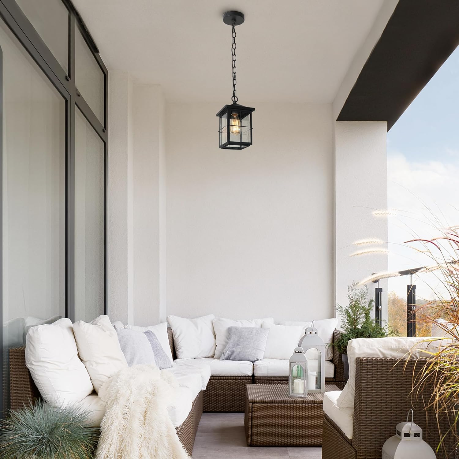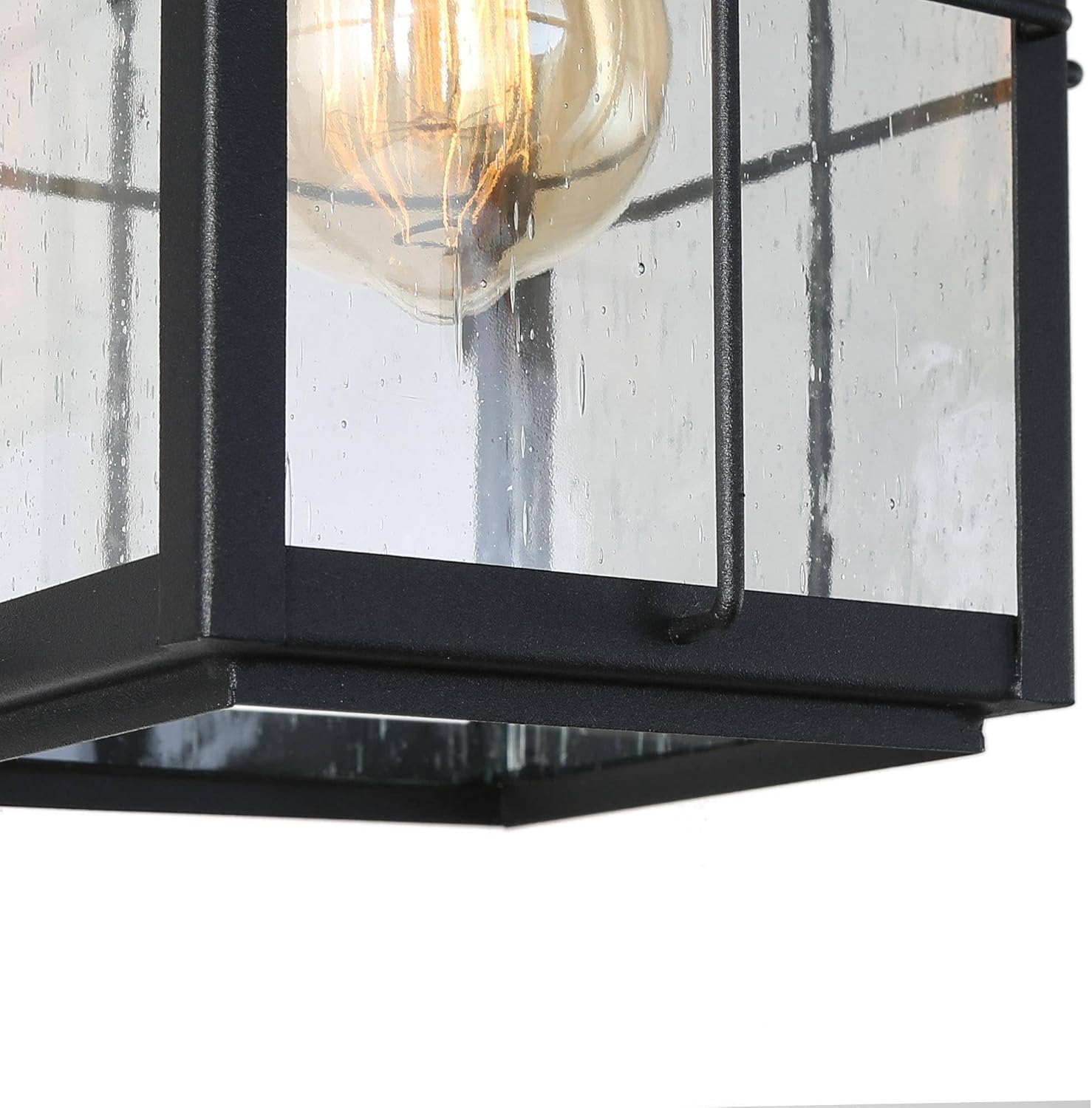 Sophisticated & Graceful Aesthetic: The outdoor hanging light fixture boasts exquisite cross bars encircling its body, accentuated by a captivating stepped design on the light top. This combination not only adds durability but also imparts a unique charm. The clear seeded glass panels harmonize flawlessly with the elegant matte black finish, creating a stunning ensemble that effortlessly complements any farmhouse exterior.
