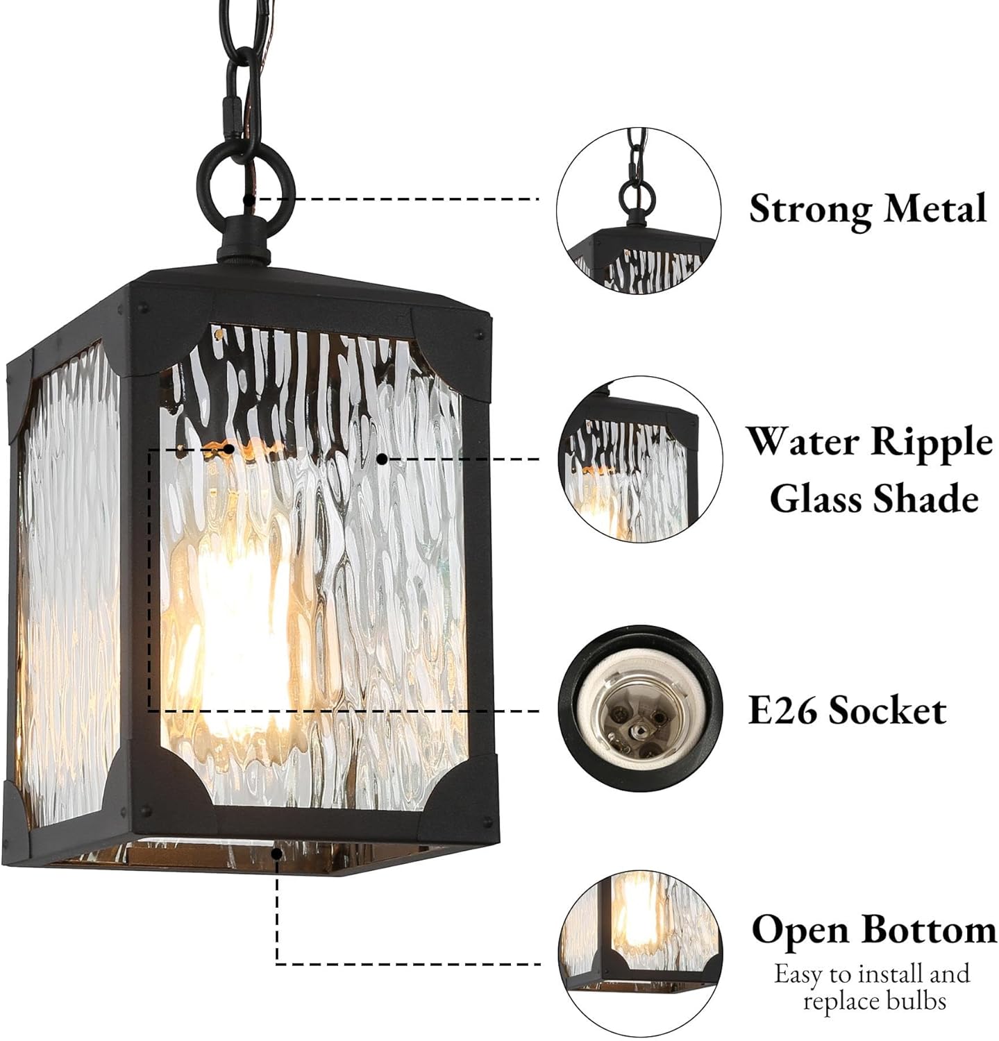 Elegant Water Ripple Aesthetics: Elevate your outdoor environment with a touch of grace and sophistication by introducing our exquisite outdoor hanging light fixture. Meticulously designed in a timeless black finish, this hanging light becomes the ultimate enhancement for your patio, garden, or any other outdoor oasis. Its distinctive charm lies in the water ripple glass, which casts a mesmerizing and enchanting illumination, infusing any space with an aura of refinement.