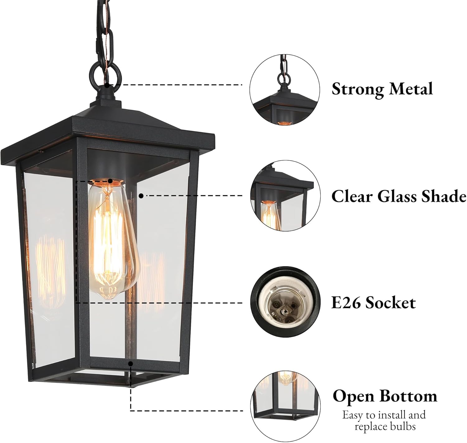 Easy Installation & Bulb Requirement: Open bottom design for easy bulb replacement. Comes with an assembly kit and detailed user manual, and the exterior hanging lanterns can be installed easily. The outside light fixtures need 1 x Max 60W bulb with an E26 base. Compatible with LED, CFL, or Sensor Bulbs.