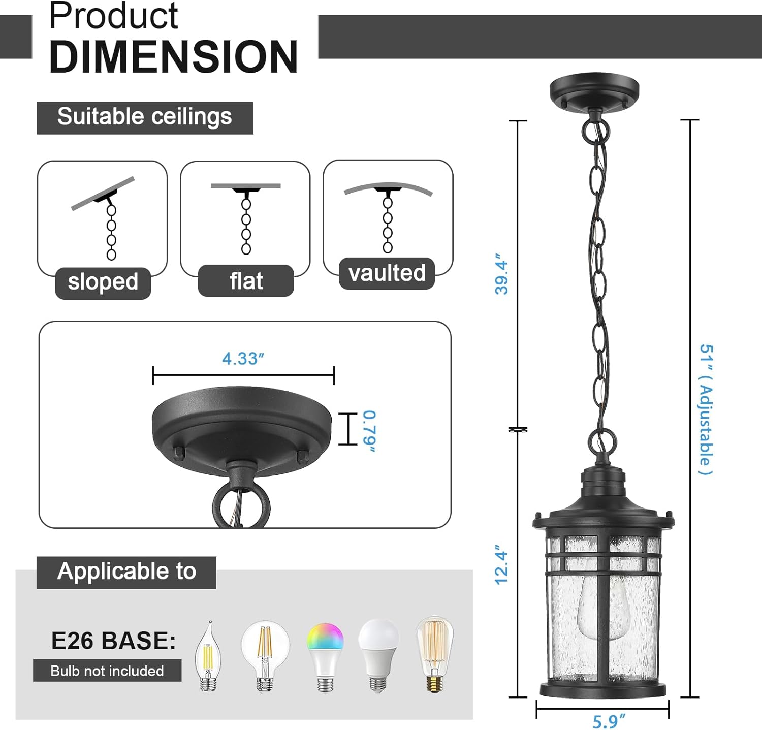 SIZE AND BULB – Ceiling Canopy: Dia.4.33″; With a 39.4″ fully adjustable chain. Outdoor Light supports all E26. Fully compatible with LED, Incandescent, CFL, Halogen (Bulb not included).