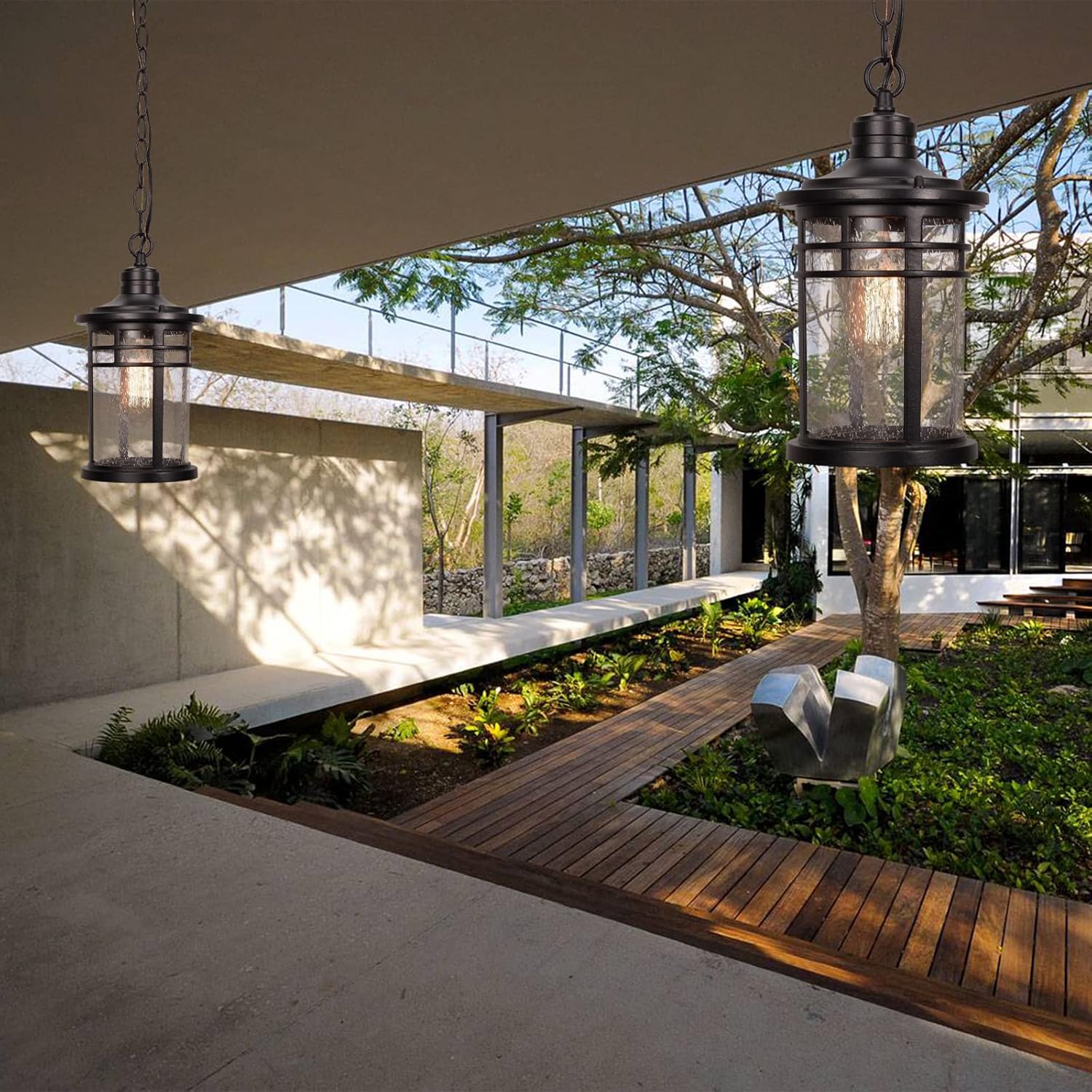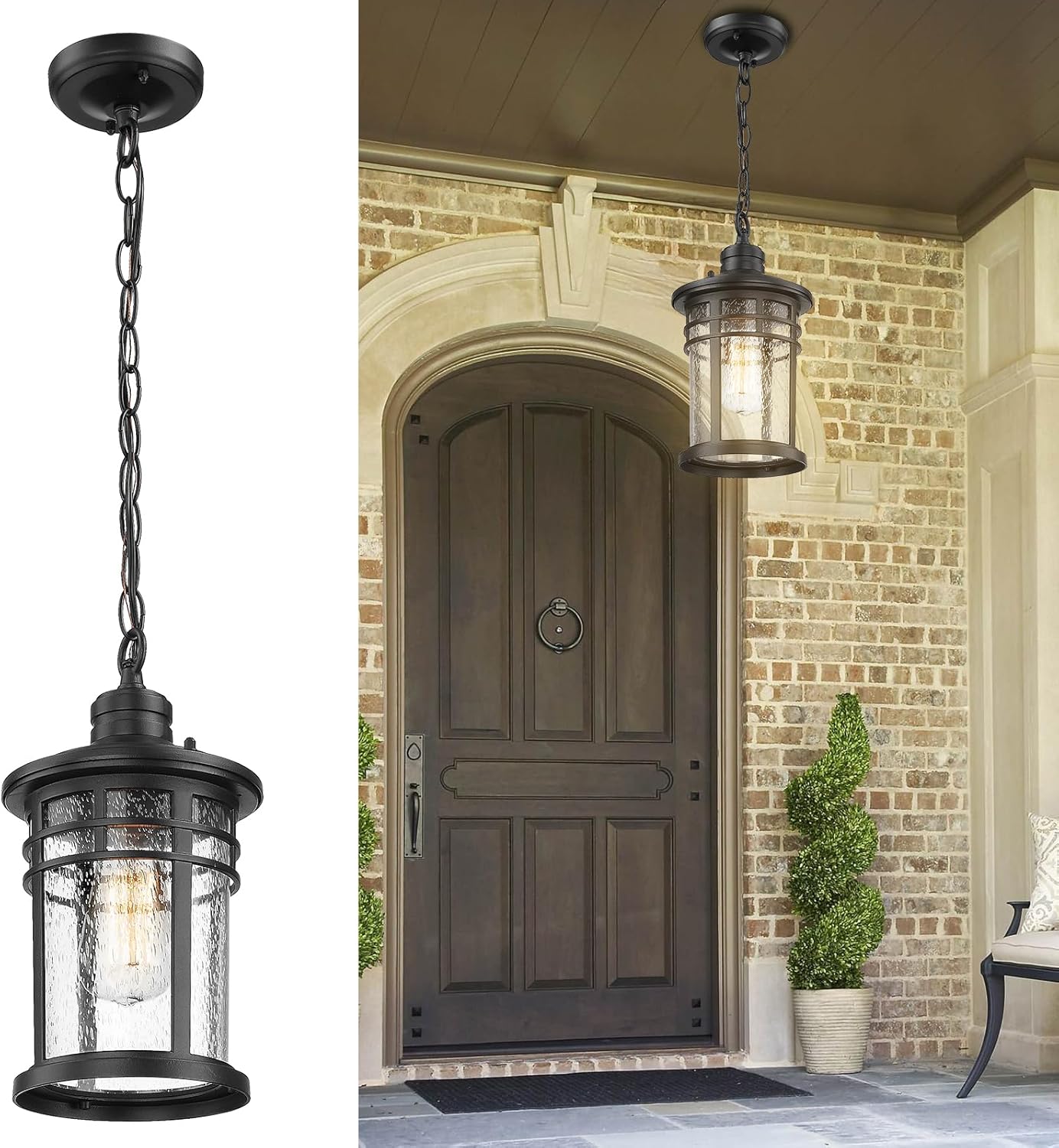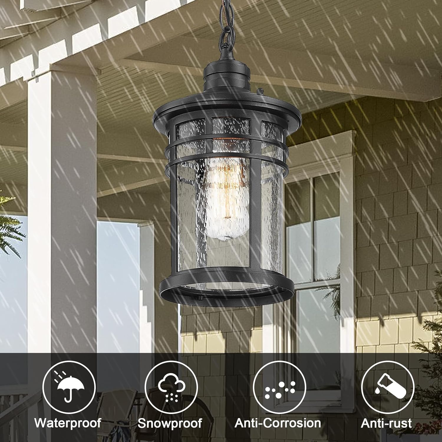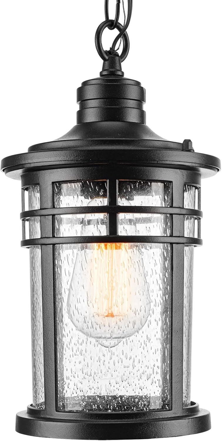 WEATHER RESISTANT – This outdoor pendant hanging lantern crafted of durable aluminum metal and seeded glass, require little to no maintenance. Rust-proof, waterproof, shock-resistant and thermally stable, don’t worry about any bad weather.