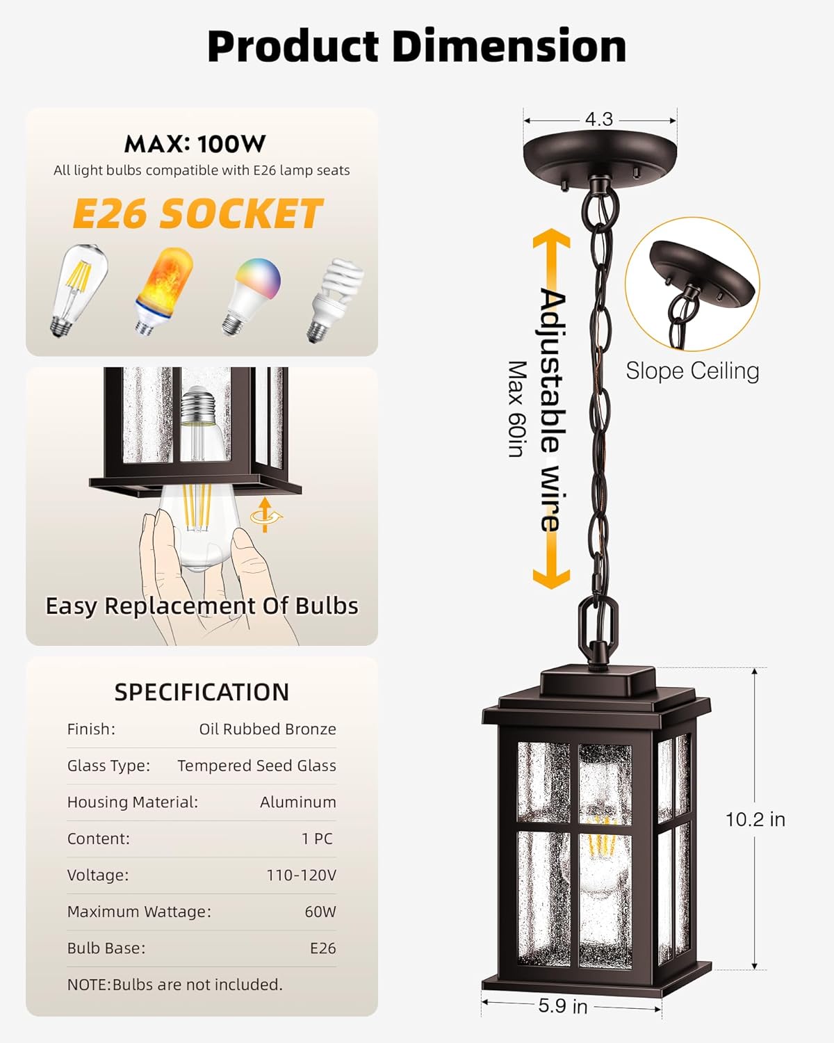 Easy to Install & Standard E26 Socket:No need to assemble by yourself. The outdoor farmhouse hanging porch light fixture is easy to install and only takes a few minutes to complete. The bottom opening design makes it extremely simple to replace the bulb, and no tools are needed. The bulb socket fits any bulb with a standard E26 socket, Max 100w, Including LED, CFL,halogen, etc… (Bulbs Not included)