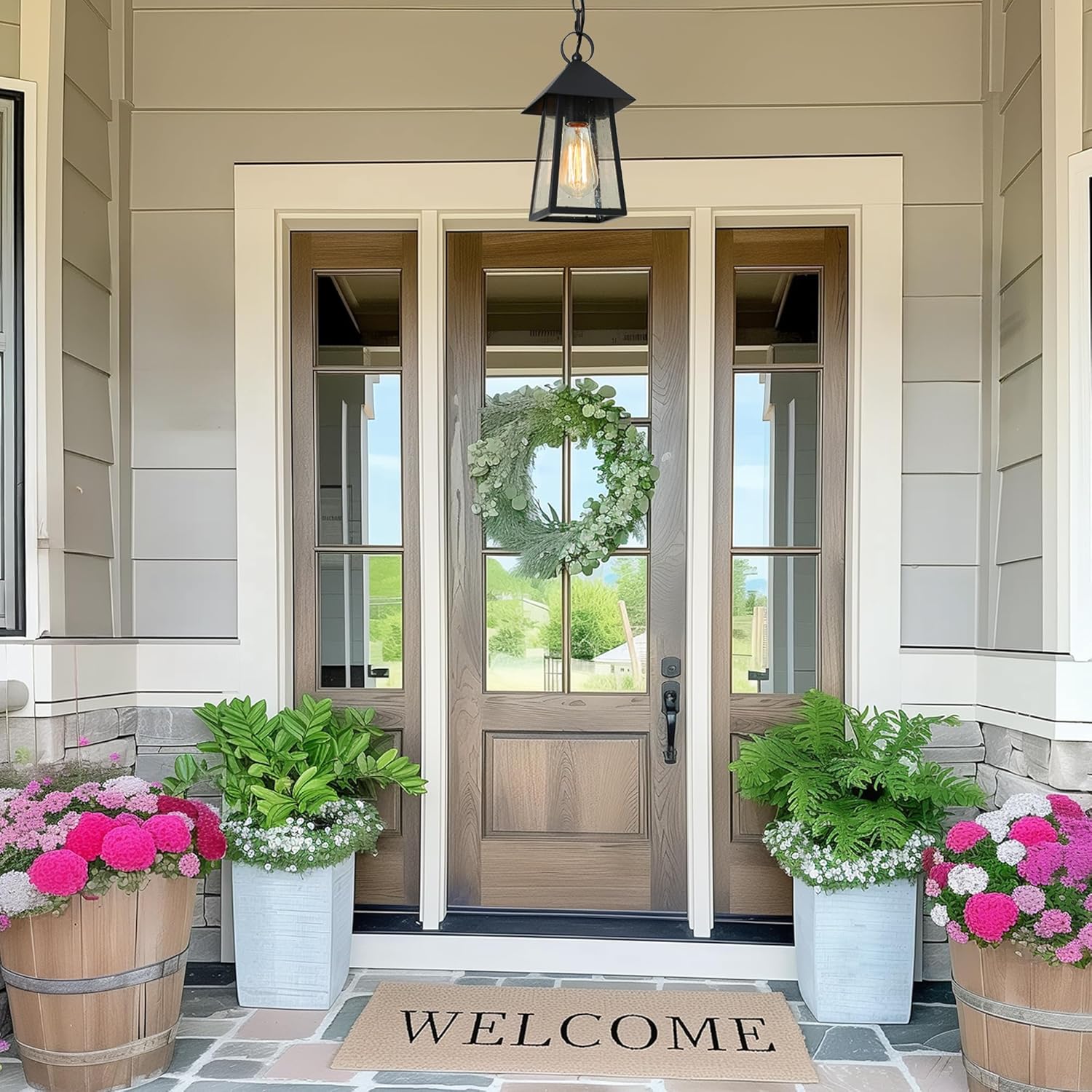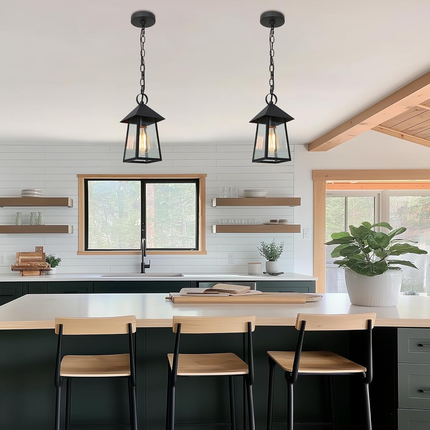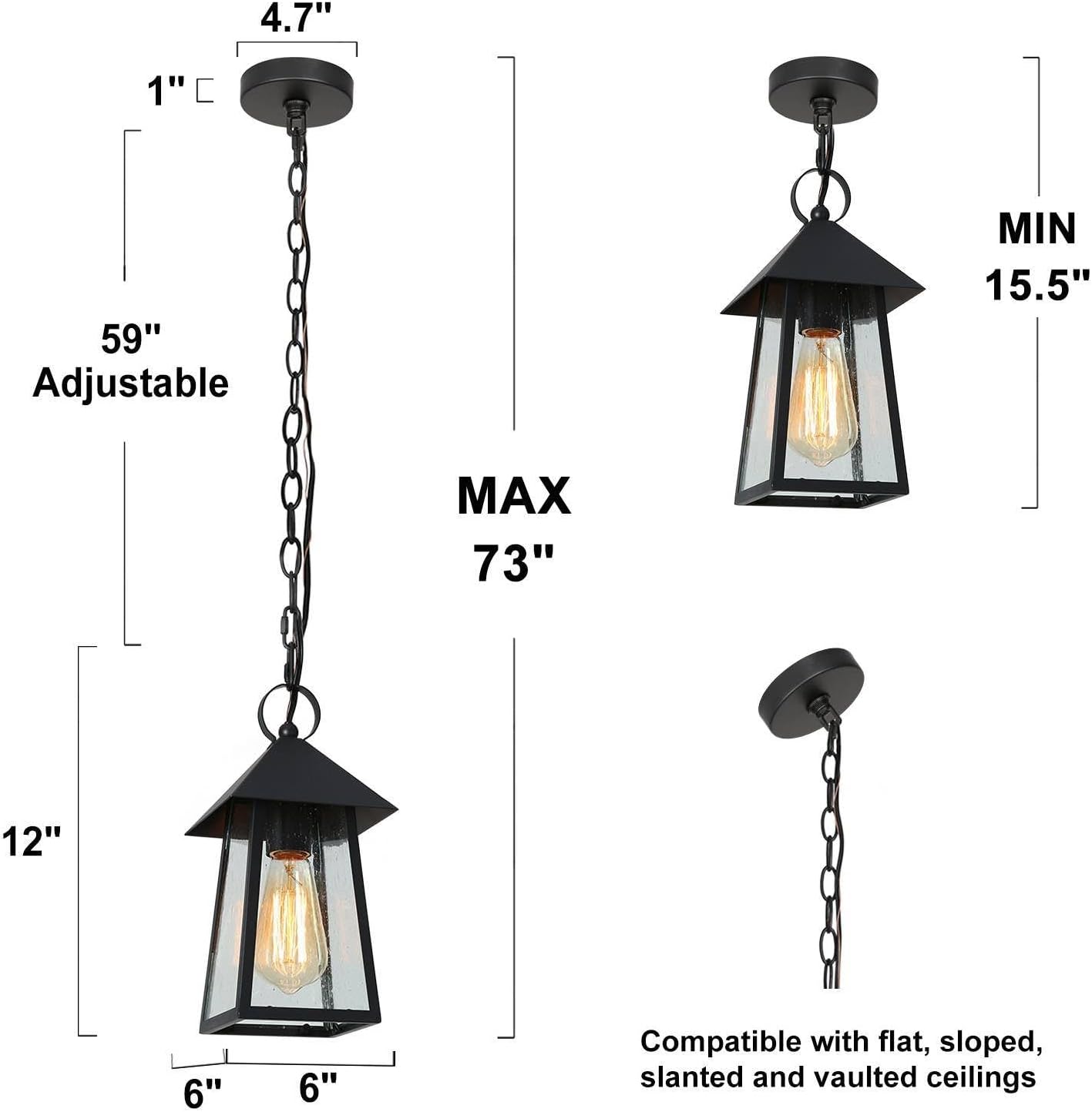 Adjustable & Versatile Fit: This outdoor hanging light measures 6″ L x 6″ W x 12″ H and includes a 59″ adjustable chain, allowing a total hanging height from 15.5″ to 73″. The adjustable length offers flexible installation on flat, sloped, or vaulted ceilings—ideal for both outdoor and indoor use.