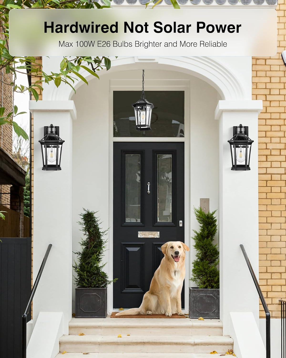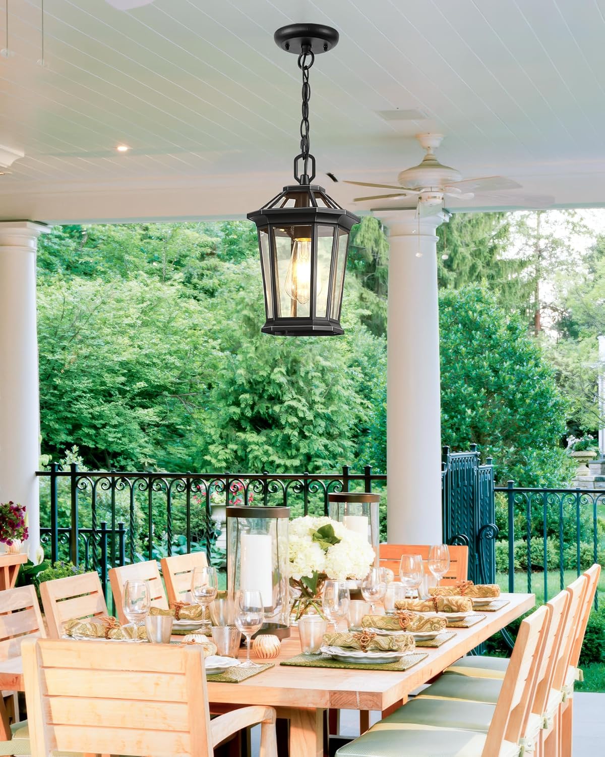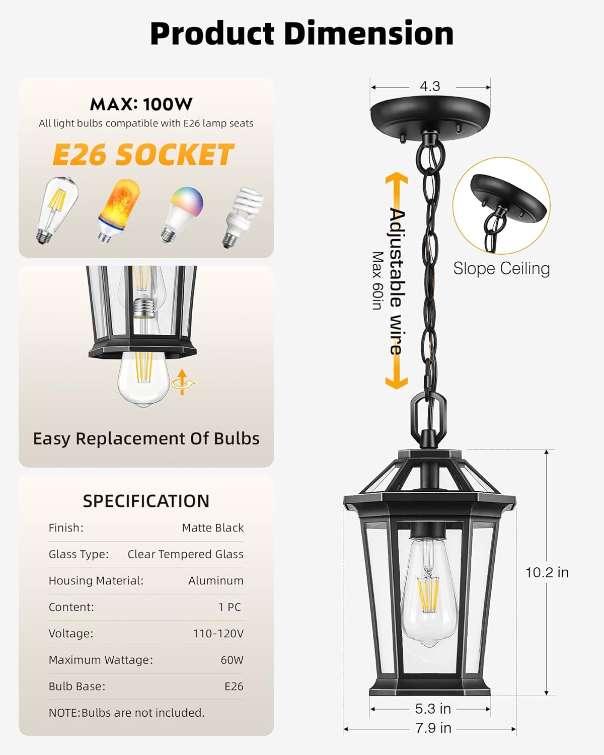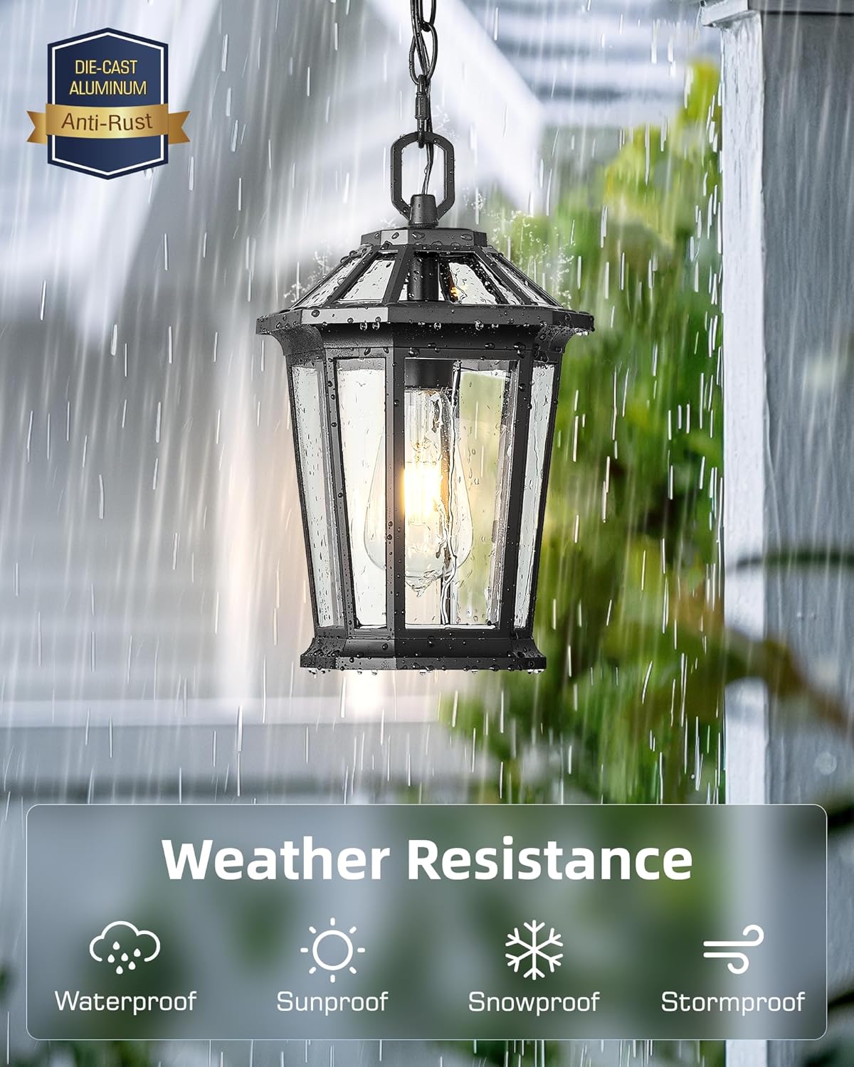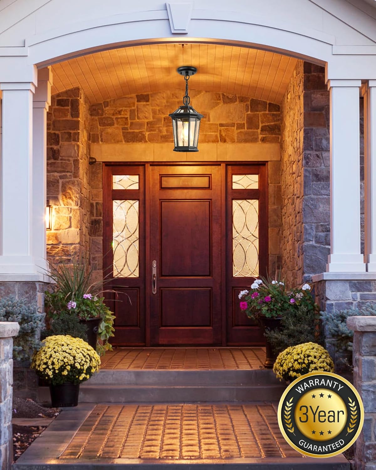 ✨[Waterproof & Anti-Rust & Weather Resistant] Assembled by 100% aluminum metal and high-hardness tempered glass material, it is waterproof, rust-proof, and weather-resistant. It is very suitable for use in outdoor environments. Whether in the outdoor garden, patio, porch, or other outdoor settings, this front door hanging light fixture is built to withstand a variety of climatic conditions and environmental elements, maintaining good looks and function.