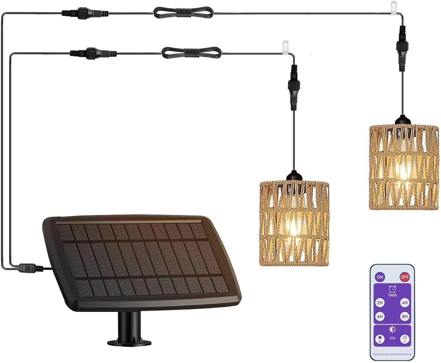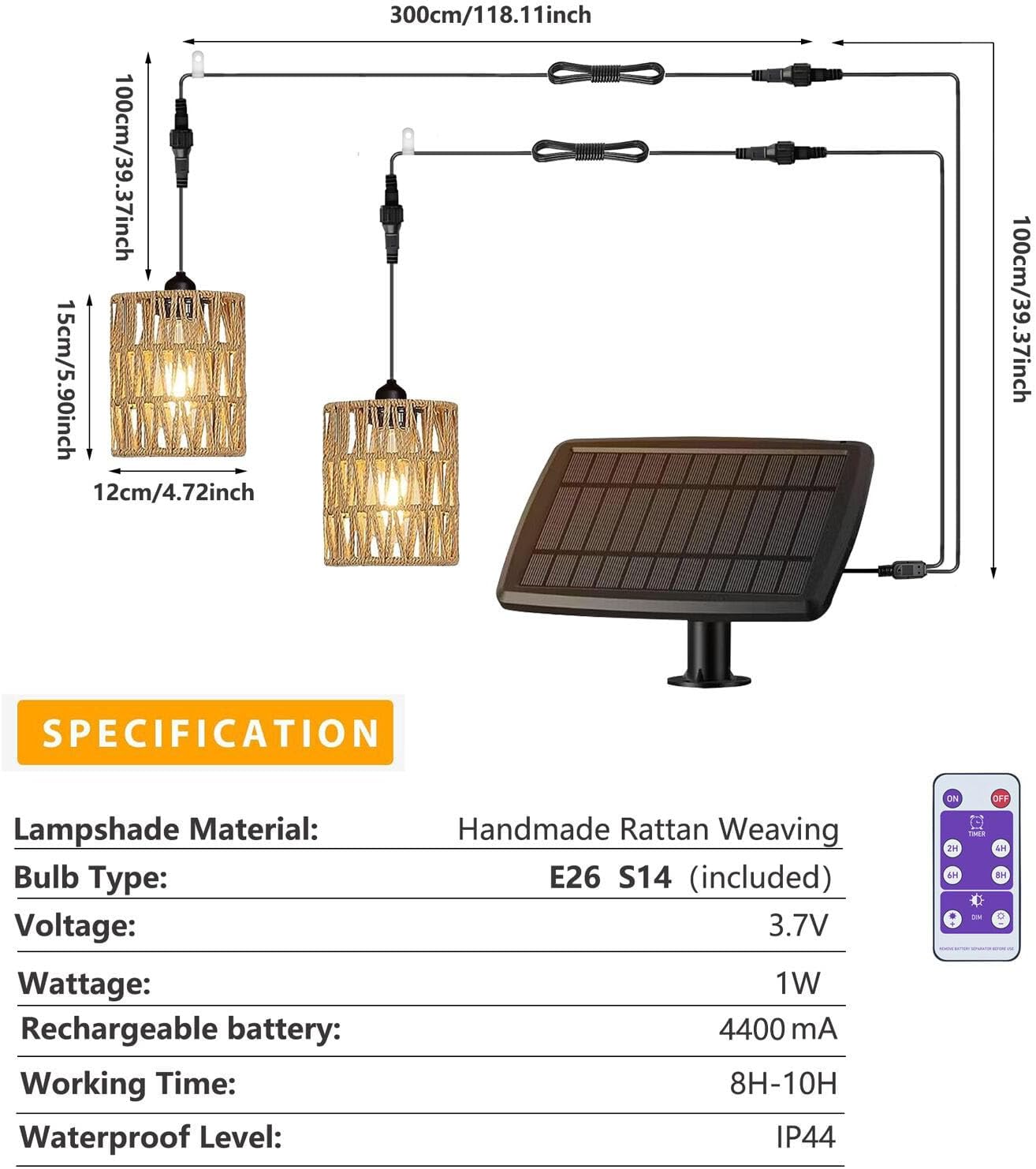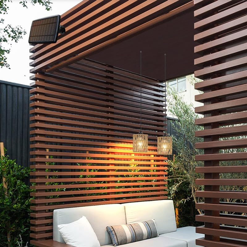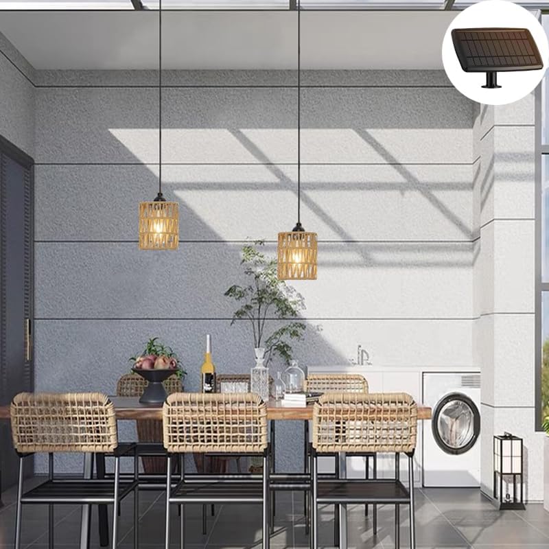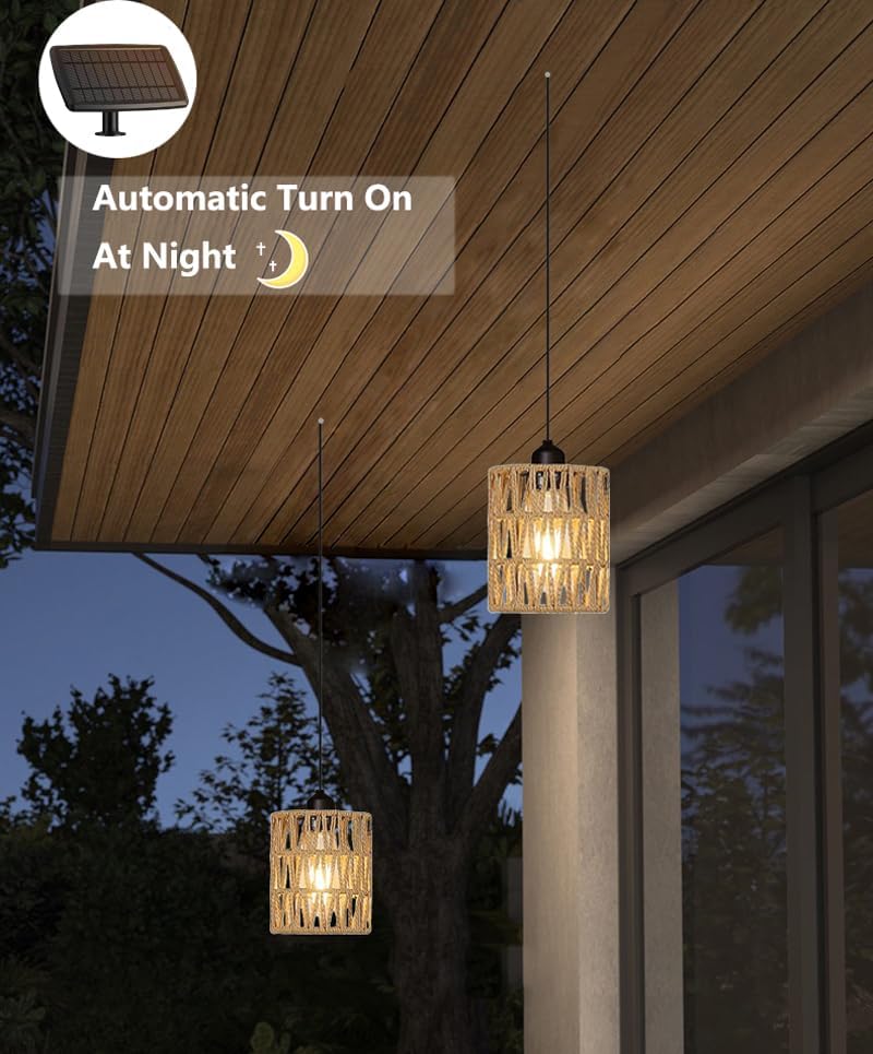 Vintage Boho Rattan Lamp Shade – The shade of this solar operated hanging light is hand woven with natural paper rattan, exuding Bohemian or rustic charm. When the ceiling light is lighting up, the braided lampshade creates a fascinating interplay of light and shadow. Its cute design softly illuminates your gazebo , porch or patio.