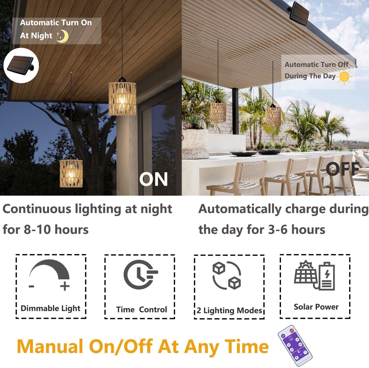 Smart Dual-Mode Activation – This outdoor chandelier charges during the day and lights up automatically at dusk for a cozy atmosphere. This outdoor chandelier for gazebo can also be manually activated and features a timer for 2h, 4h, 6h or 8h.
