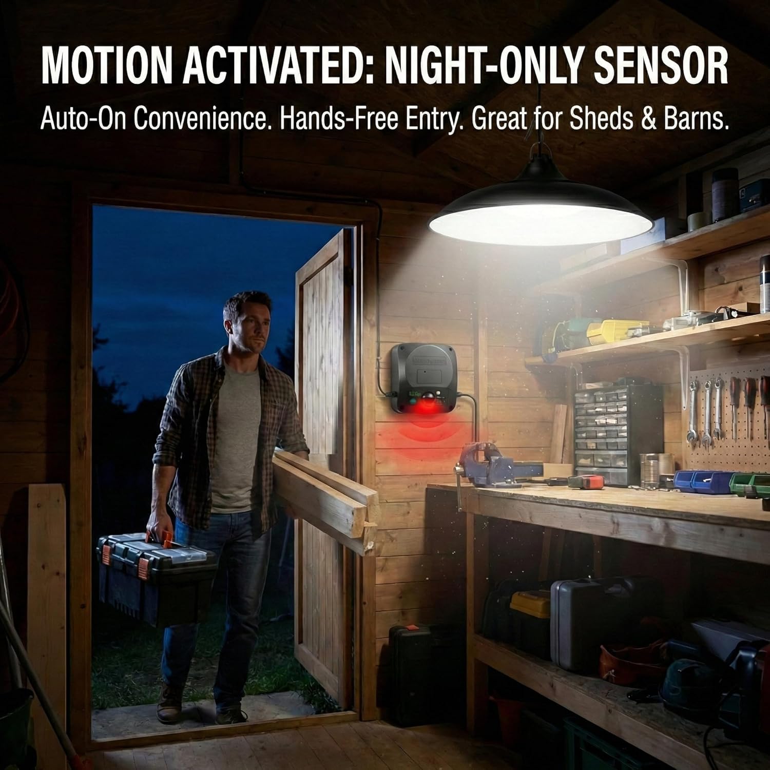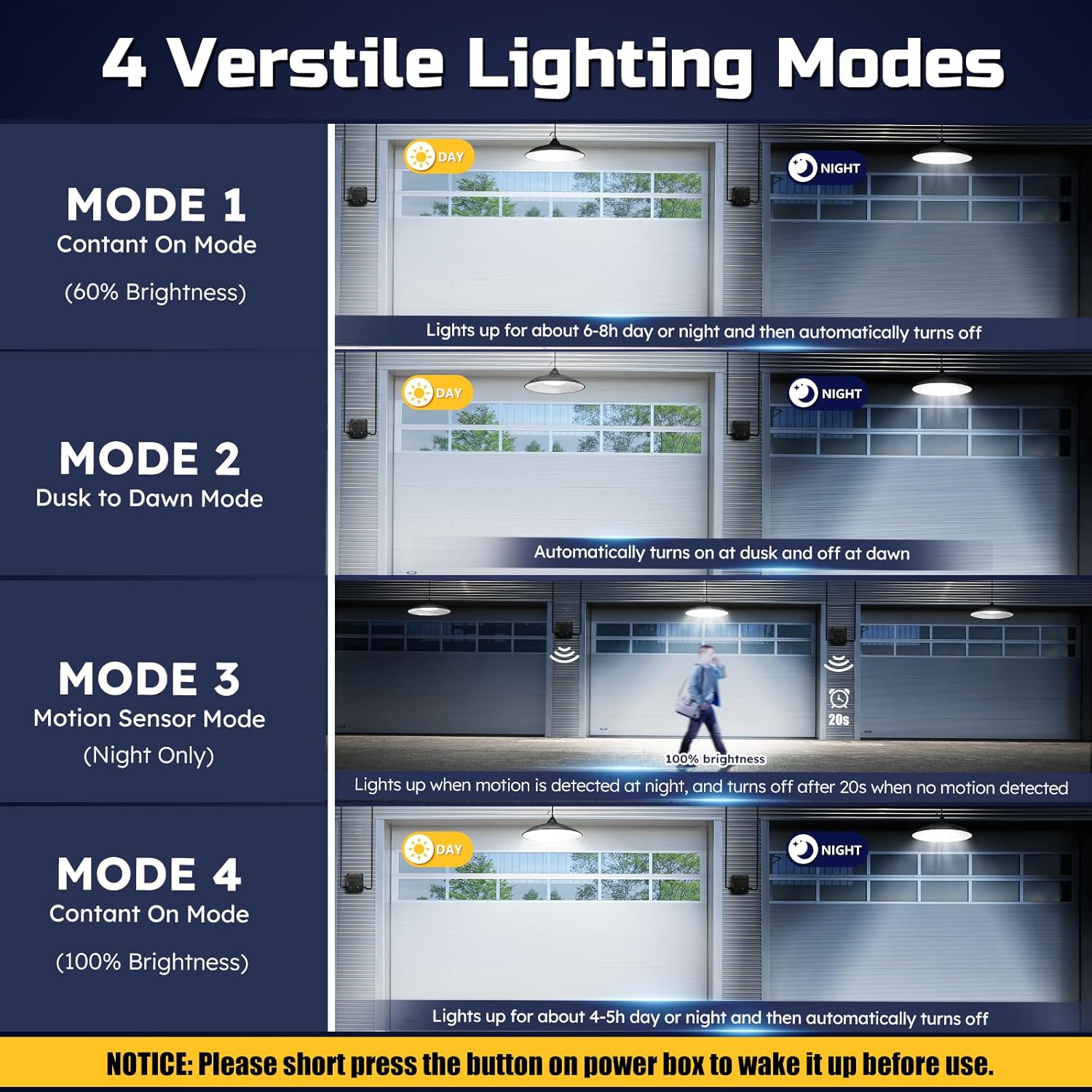 【4 Lighting Modes with Motion Sensor】 Customize your lighting with 4 different modes to fit your needs. Mode 1 (Medium Light Mode): Provides steady, medium brightness for 6-8 hours, day or night. Mode 2 (Dusk-to-Dawn Mode): Turns on automatically at night and off during the day. Mode 3 (Motion Sensor Mode): Lights up when motion is detected at night, turning off 20 seconds after no motion. Mode 4 (High Light Mode): Emits bright light for 3-4 hours, day or night.