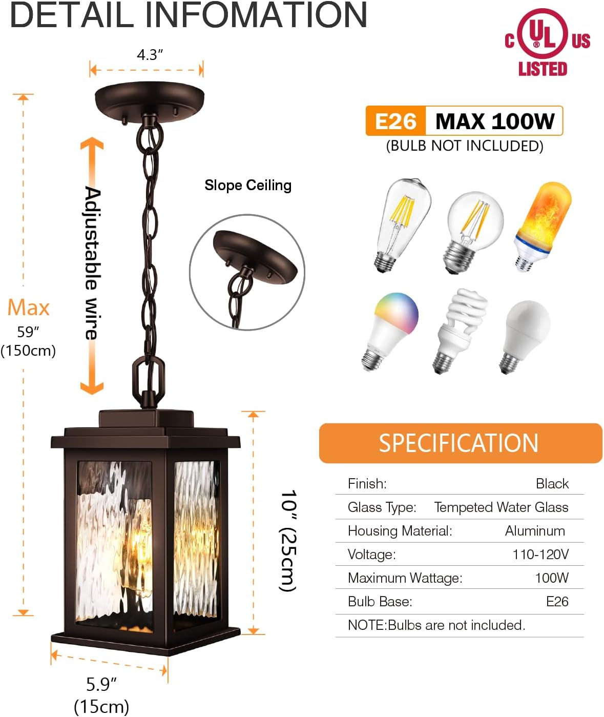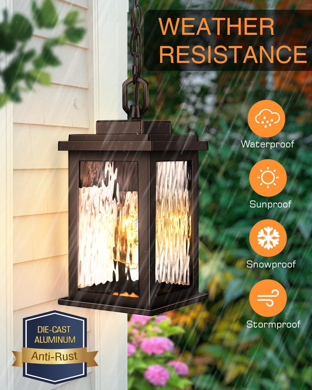✨【Distinctive Design】This outdoor pendant lights feature a water ripple glass. The outdoor hanging lights can emit soft light through the glass, creating a comfortable and warm atmosphere. The bronze exterior of the cuboid looks textured. It is suitable for many occasions such as garage, backyard, doorway, garden, and more.